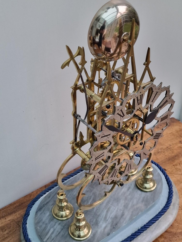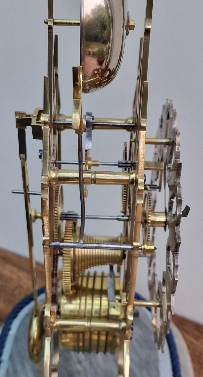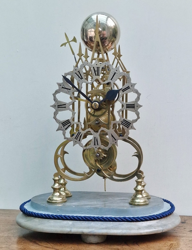An impressive and high quality English Victorian skeleton clock. An original glass dome to the stepped blue and white marble base standing on feet. A silvered fretted dial with Roman numerals. Blued steel hands. An 8-day duration fusee mechanism with passing strike on a bell. Circa 1870