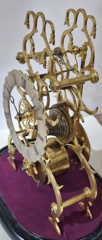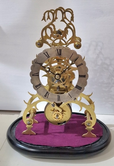 A good quality Victorian skeleton clock. A Victorian glass dome to the ebonised base standing on shaped feet. A brass frame with lovely fretted detailing. A silvered dial with Roman numerals and 'moon' blued steel hands. An 8-day duration fusee mechanism. Circa 1875.
