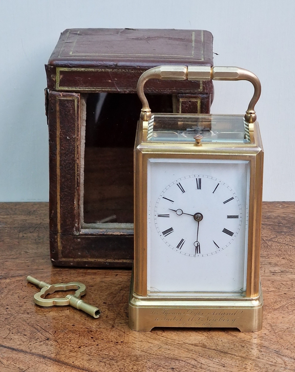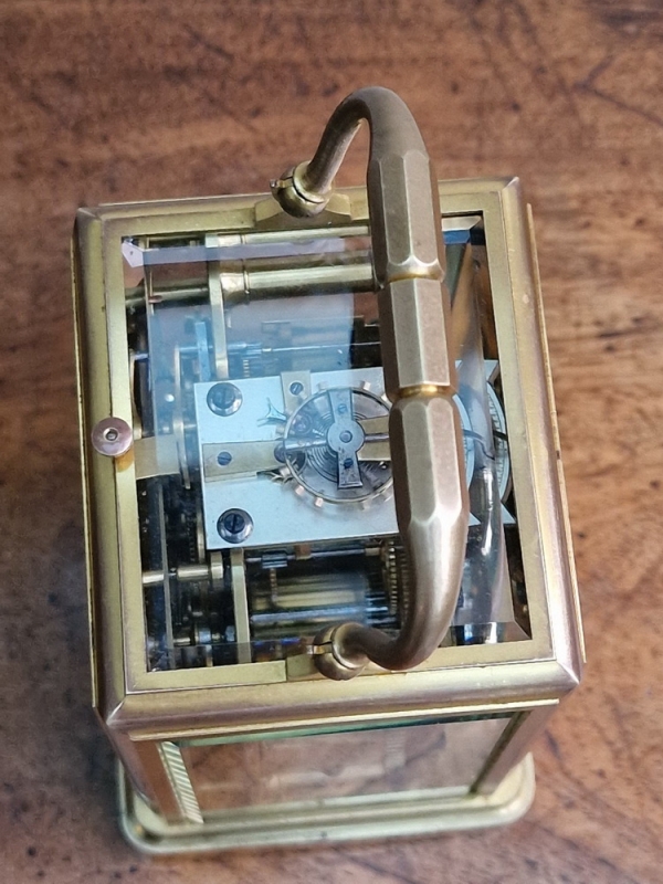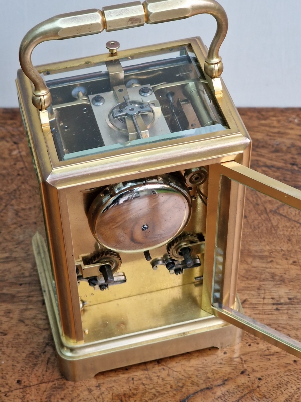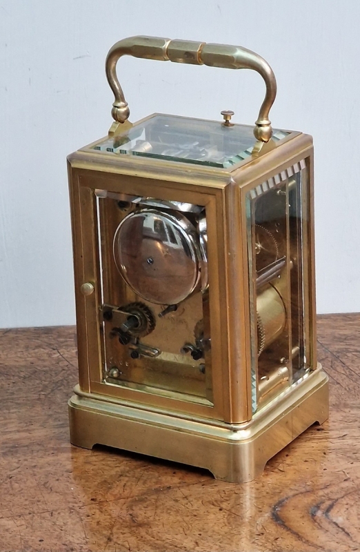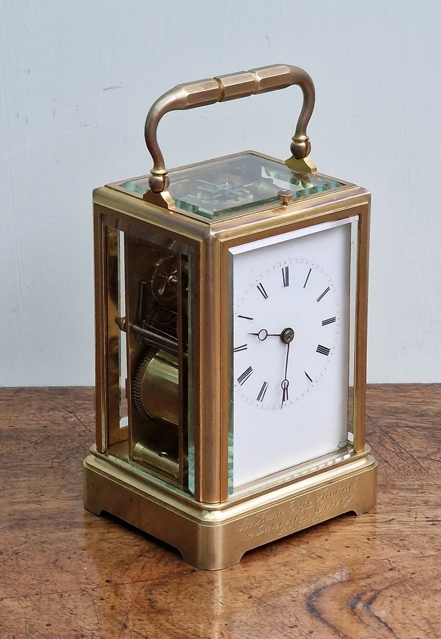 An early example of a French brass cased striking & repeating carriage clock with a great provenance. A 'one-piece case' with gilding. An enamel dial with blued steel 'moon' hands and black Roman numerals. An 8-day duration mechanism striking the hours and 1/2 hours on a bell. The original lever escapement showing through the large top glass. Push button repeating, The original travelling box and numbered key, 6408. Circa 1865.