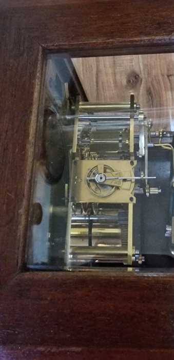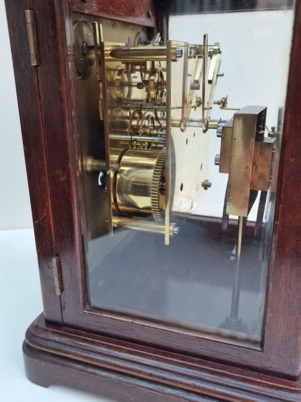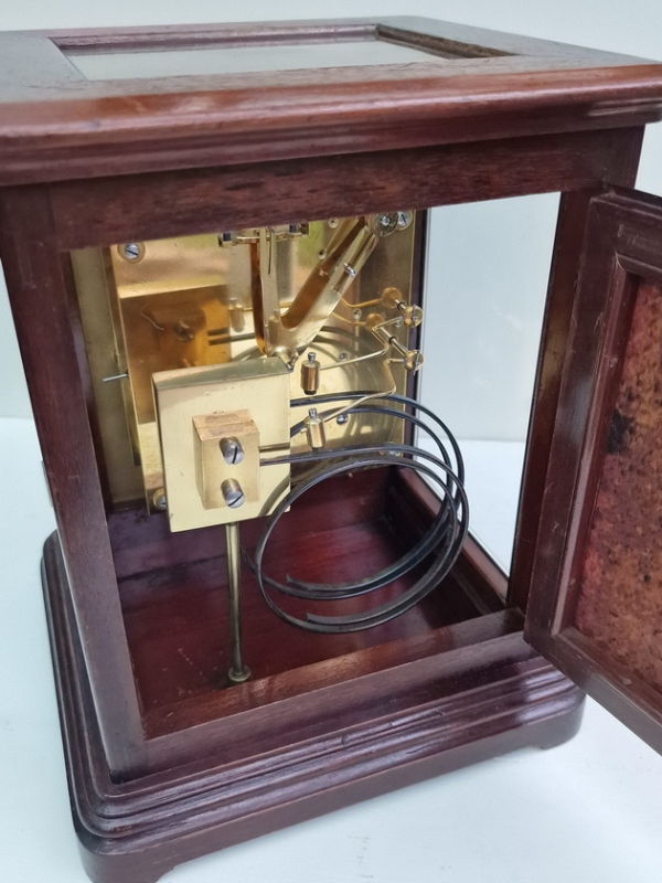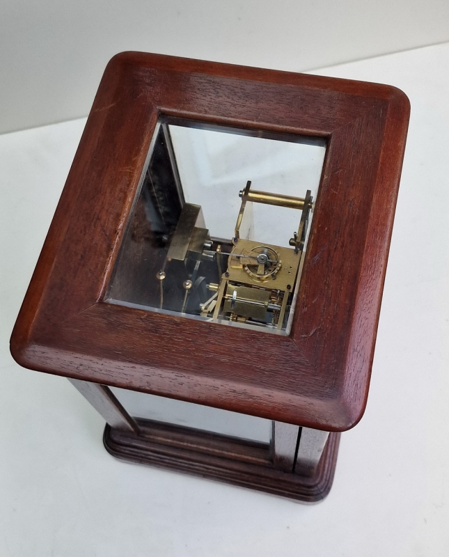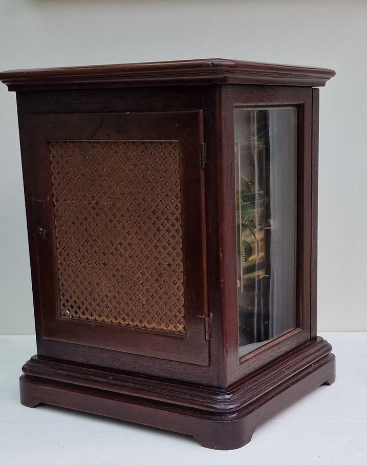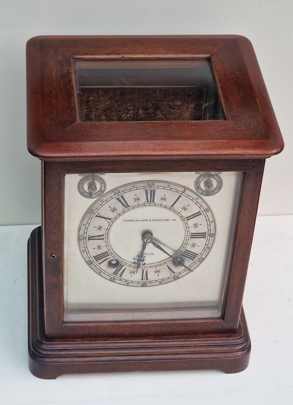 An Edwardian oak cased mantel clock. A four glass design with bevelled glass panels. A silvered dial with strike/silent and slow/fast dials to the top. Roman numerals to the chapter ring and signed by retailers ''FRANKLIN HARE & GOODLAND LTD TAUNTON'. A high quality ting-tang, quarter striking mechanism of 8-day duration. A platform escapement visible through the top panel. Circa. 1910.
