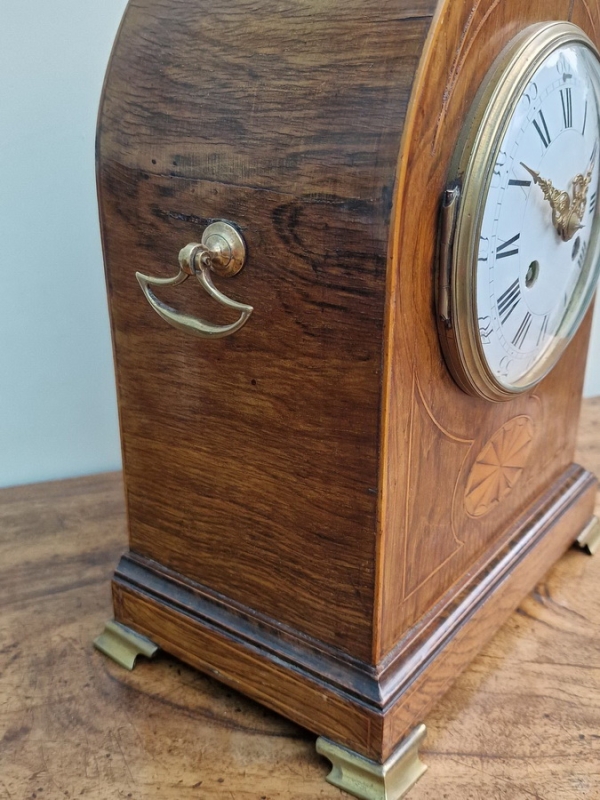 An Edwardian mantel clock of Georgian design. A rosewood case with line inlays to the front and a parquetry inlaid fan. An arched pediment and 2 brass side handles. Brass ogee bracket feet. Fretwork to the rear door sound panel. A convex enamel dial with Roman numerals and nice decorative gilt hands. An 8-day duration mechanism striking the 1/2 hours and hours on a gong signed Marti of Paris. Circa 1910.