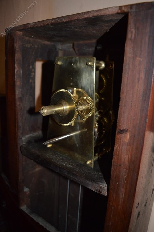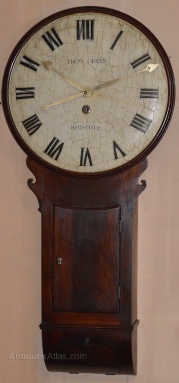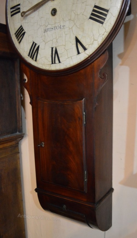 An English Tavern wall clock. A 22" wooden dial with brass counterbalanced hands. A well proportioned mahogany case with the original side carvings. An opening trunk door and base with twin side doors behind the dial. An 8-day duration mechanism, single weight driven. The original pendulum and lovely original shaped weight. The case and dial have not been over restored through the years and is presented in 'aged condition'.