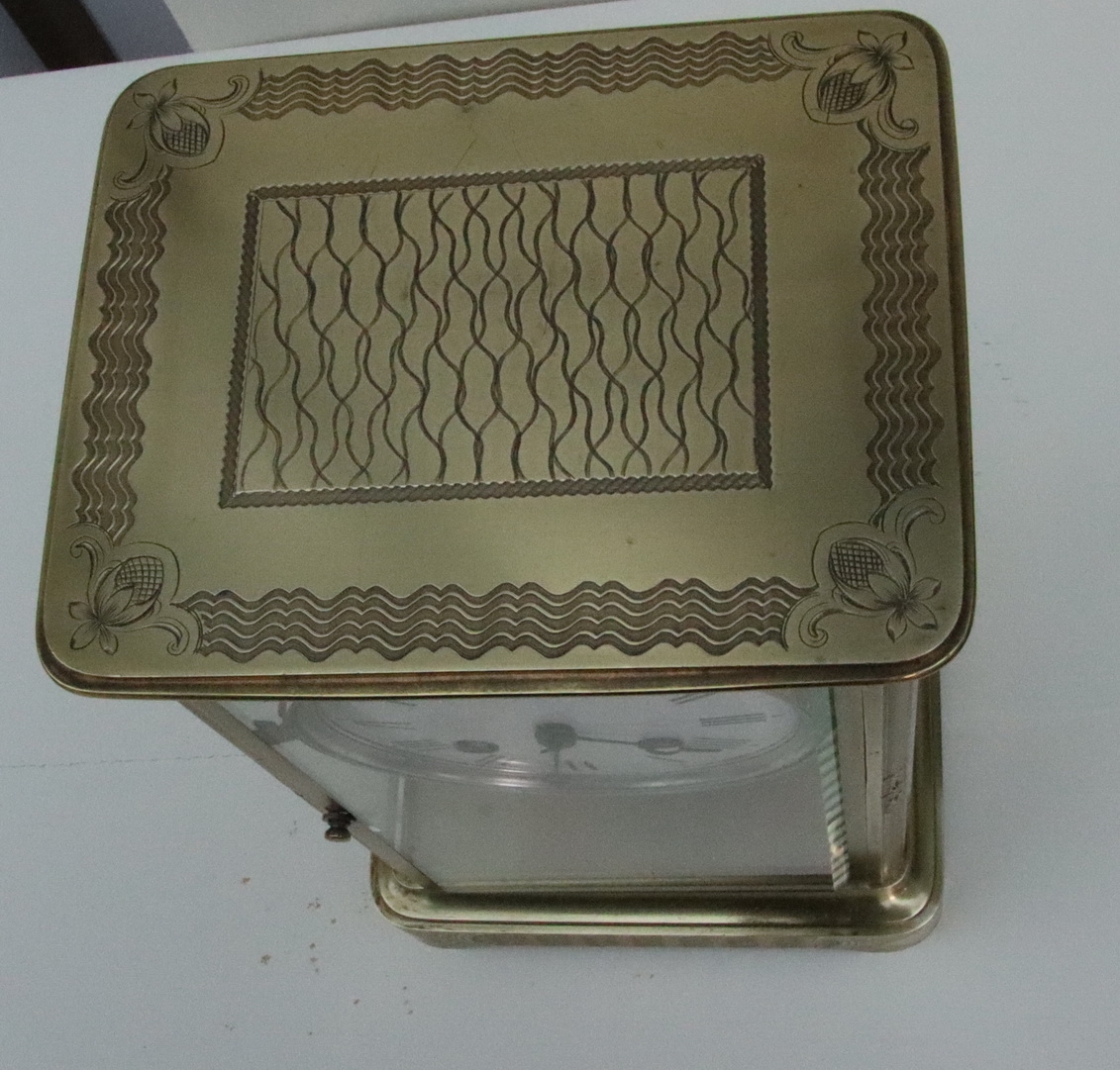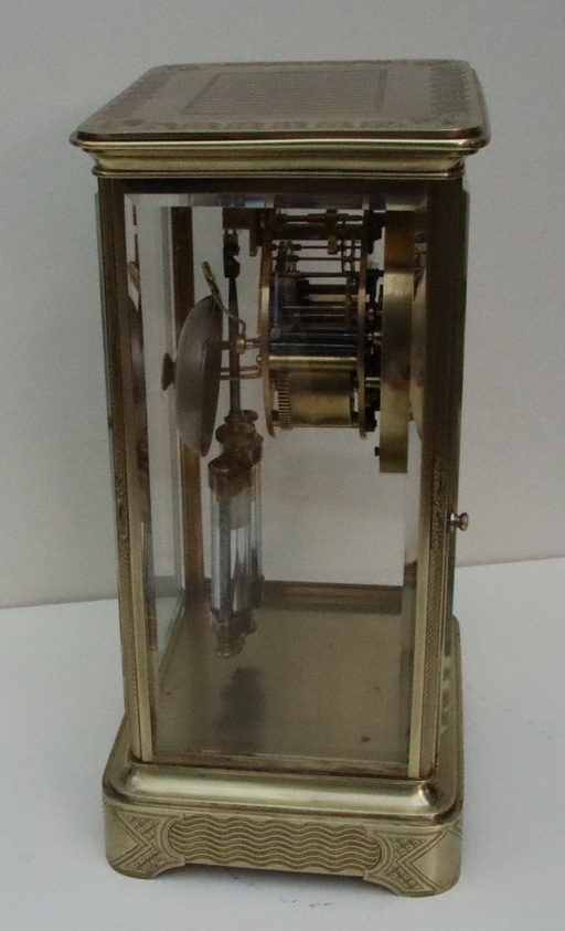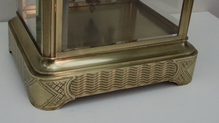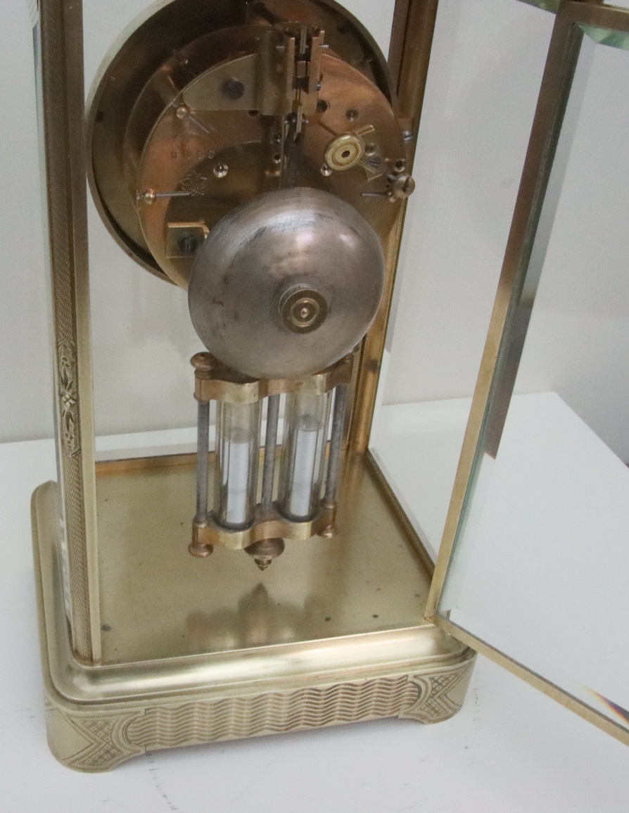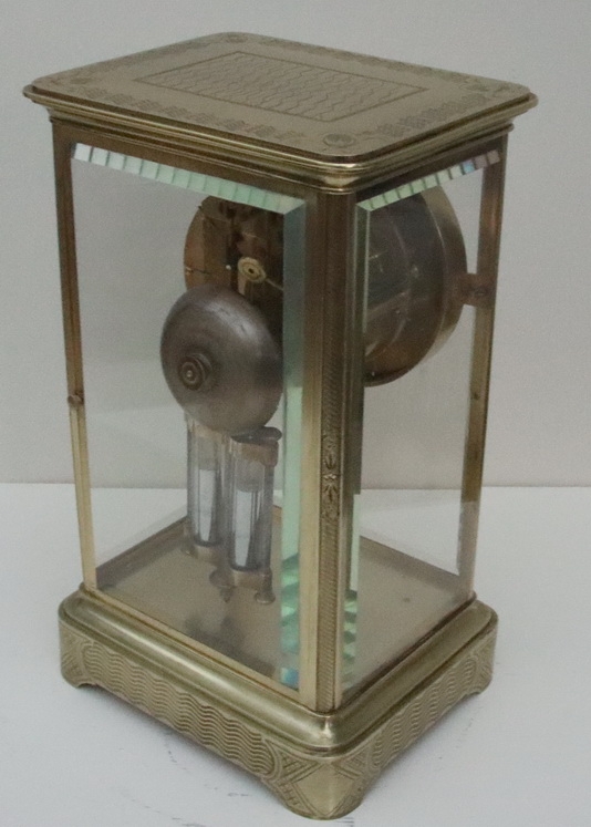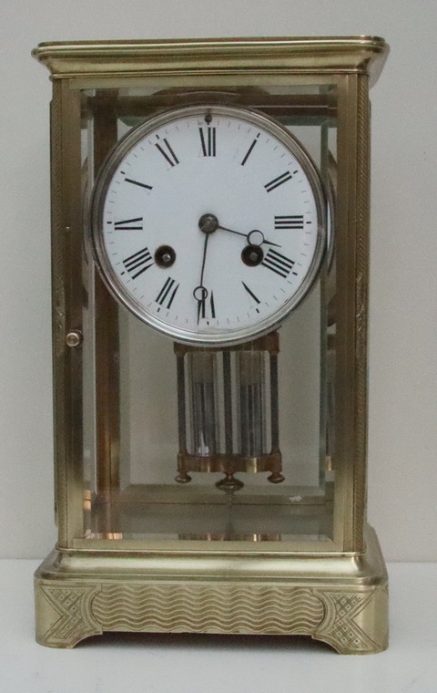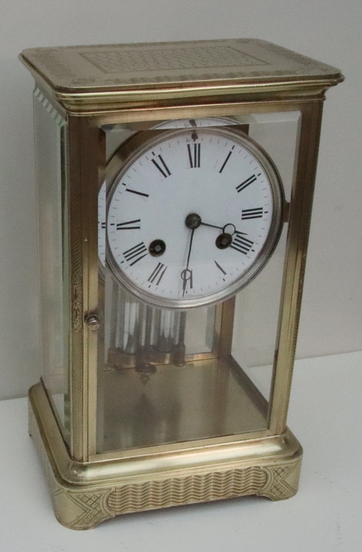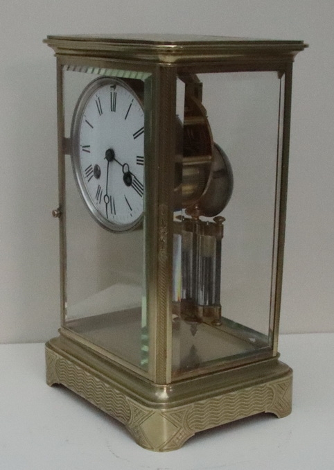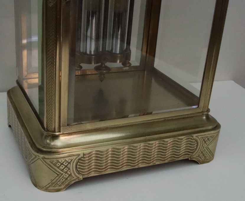 A French engraved cased four glass mantel clock. Bevelled glass panels with opening front and rear doors. Lovely engraving to the base, pillars and case top. An enamel dial with 'moon' blued steel hands. A mercury compensating pendulum. An 8-day duration mechanism striking the 1/2 hours and hours on a bell by Japay Freres. Circa 1890.