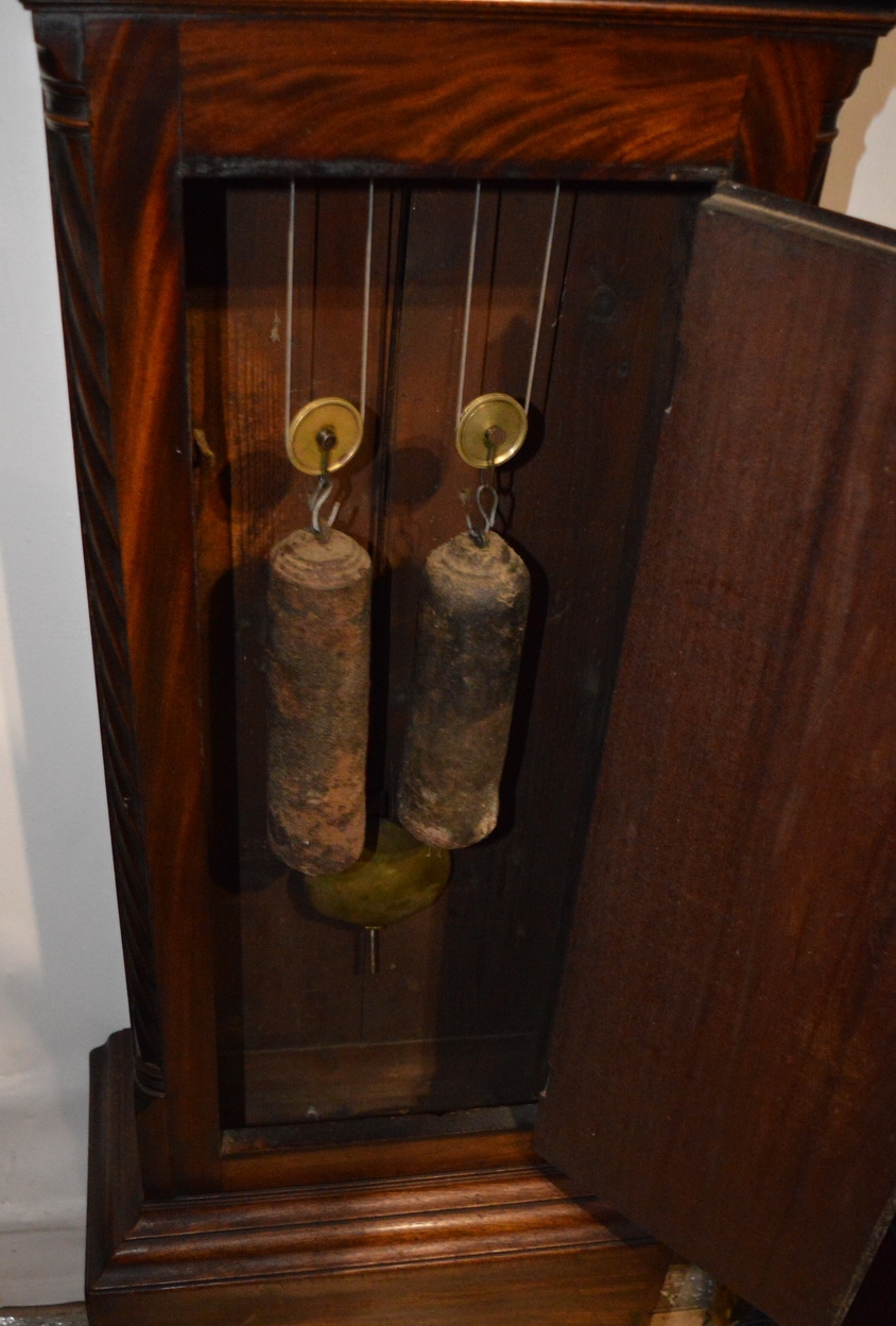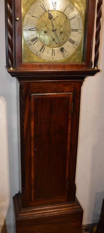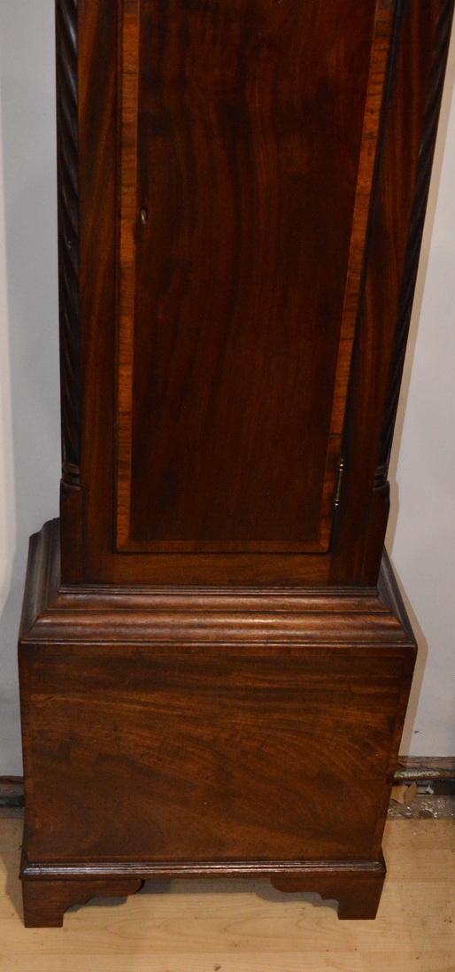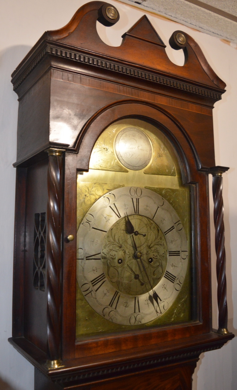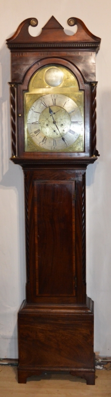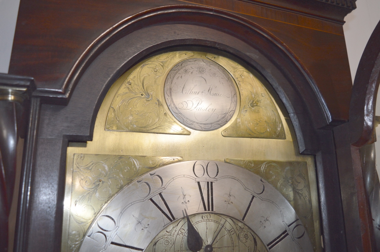A Scottish Georgian longcase/Grandfather clock by Arthur Howie of Paisley. A mahogany case with choice flame mahogany veneers and satinwood crossbanding. A swan-neck hood pediment with dentil cornice mouldings and twisted brass capped side columns. Matching trunk side columns. An arched brass and silvered dial with date and seconds indicators. A well engraved dial centre. An 8-day duration mechanism striking the hours on a bell. Circa 1795.
