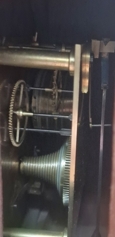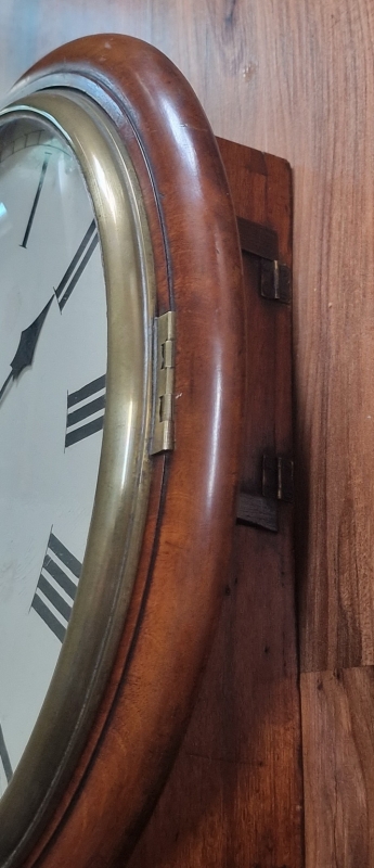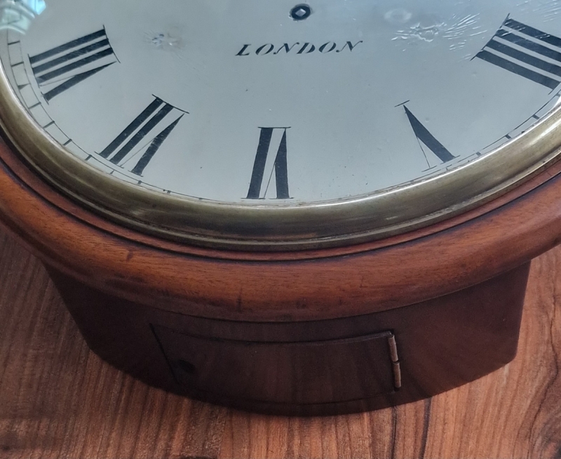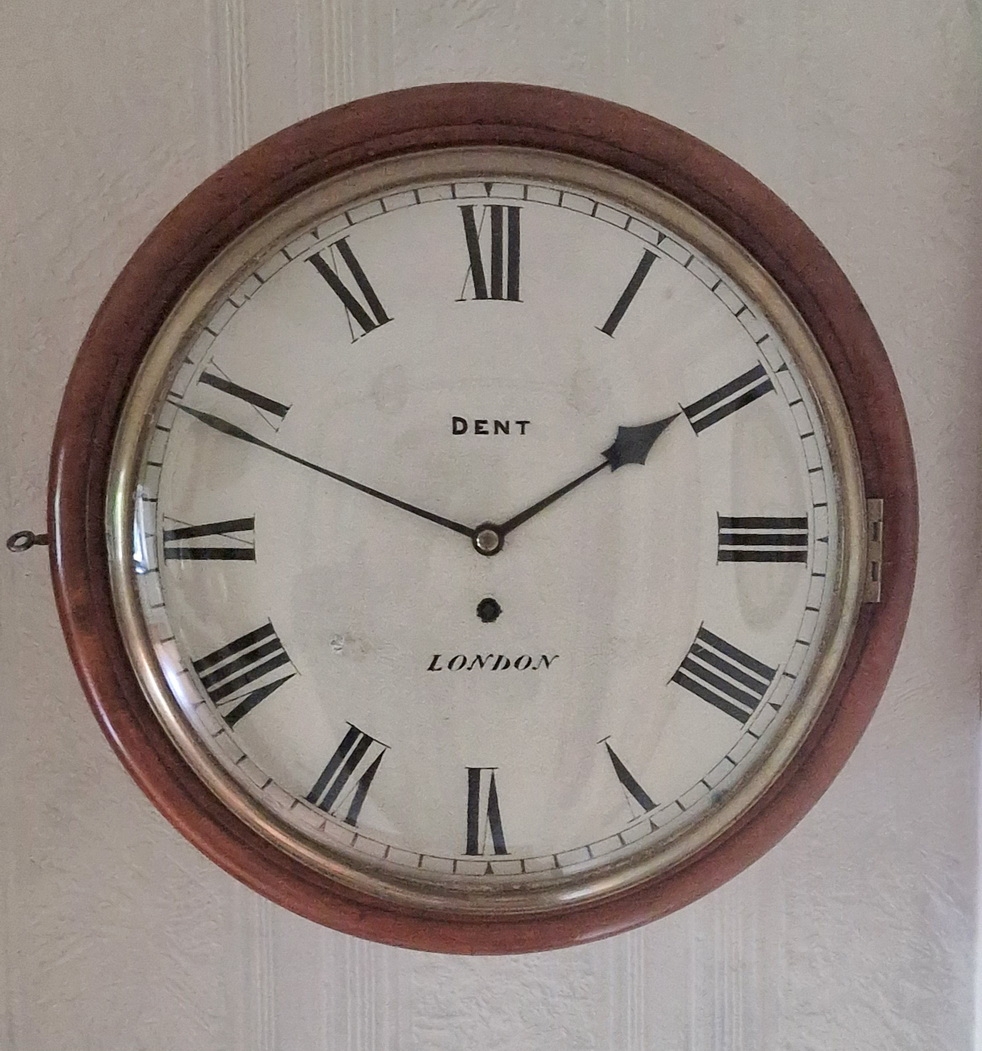 An early Victorian fusee dial wall clock. A 12" painted dial signed 'Dent London' with blued steel hands. A mahogany case case of good colour with a cast brass bezel surround. An unusually slim case. An 8-day duration fusee timepiece mechanism of high quality. Circa 1840.
