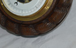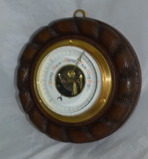 An Edwardian aneroid barometer, An oak rope twist design case. A brass bezel surround with bevelled glass and brass indicator hand. An enamel dial with pressure range from 26 to 31 and a visible mechanism. Circa. 1910.