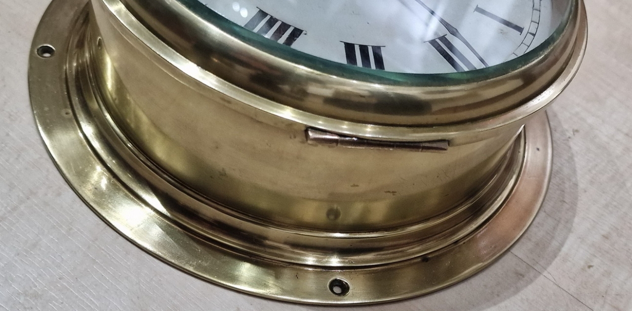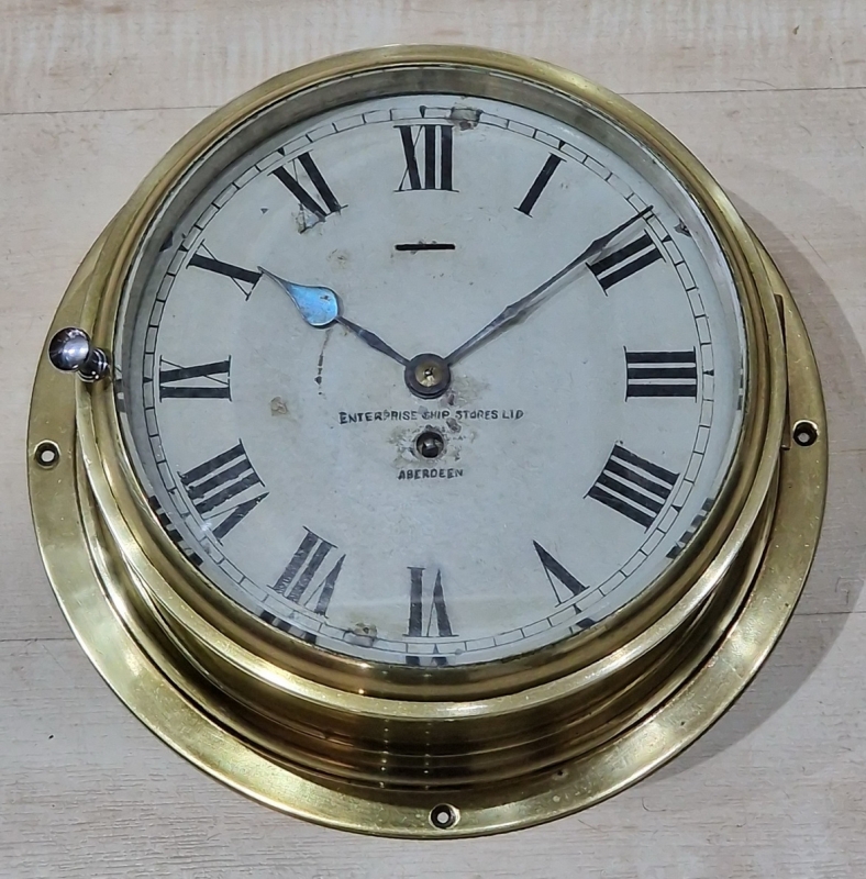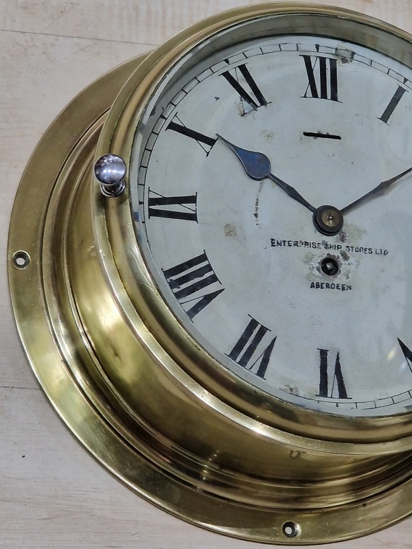 A Scottish brass ships bulkhead clock. Bevelled glass to the opening front bezel. A good quality brass case. A painted dial with a Slow/Fast regulator adjuster. Retailer 'ENTERPRISE SHIPS STORES LTD ABERDEEN' to the dial. Blued steel hands. A 7-day timepiece mechanism by Buren. Circa 1930.