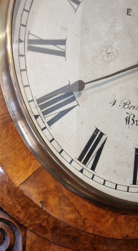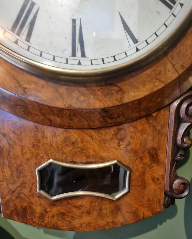 A Victorian fusee drop dial wall clock. A 12" painted dial signed 'E FEAR 4, BRISTOL BRIDGE, BRISTOL'' with blued steel hands. A lovely quality burr walnut case with choice veneers. A brass bezel surround. The original side carvings to the base with a brass edged pendulum window.