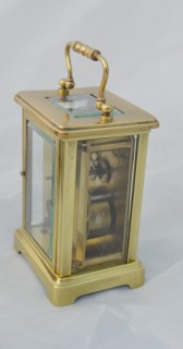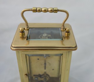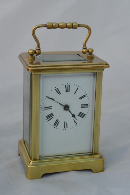A French brass cased carriage clock. An enamel dial with blued steel hands. An 8-day duration timepiece mechanism. The original escapement. Complete with the original travelling box. Circa 1895.