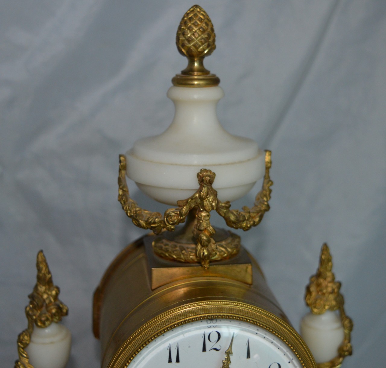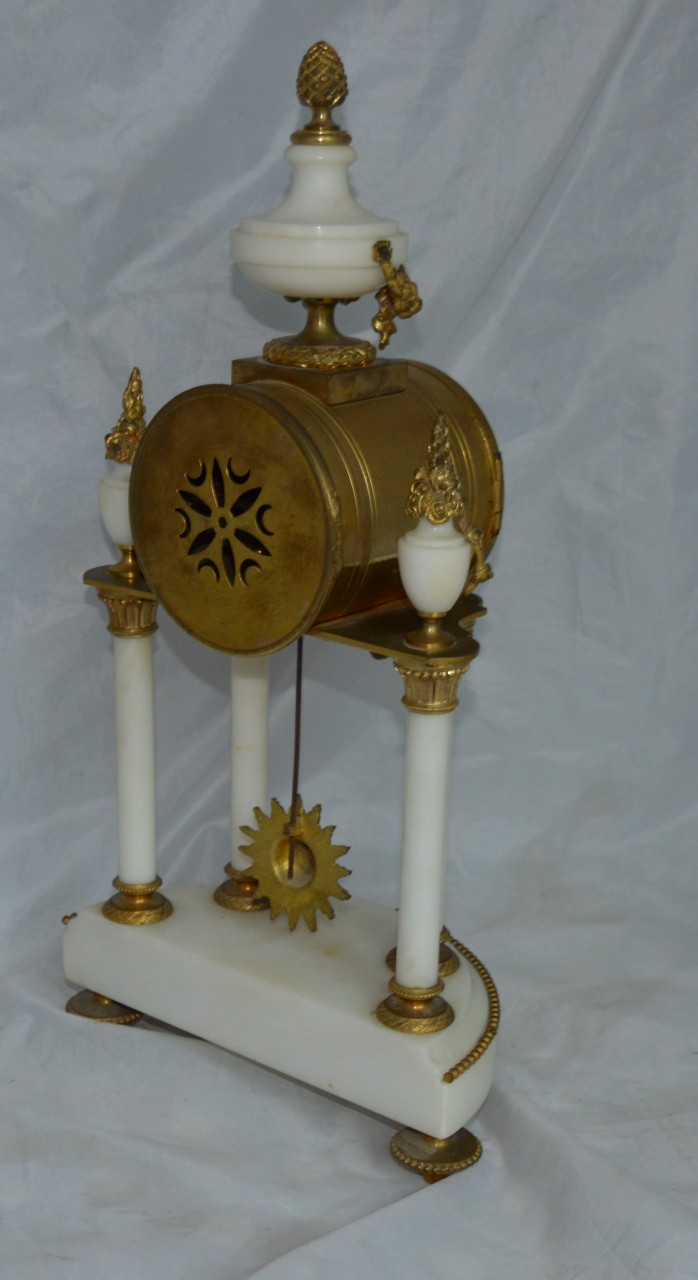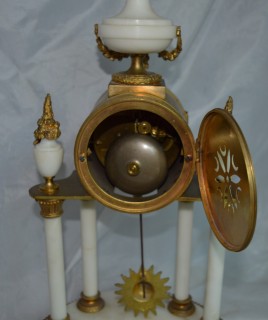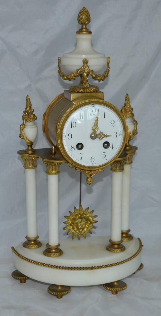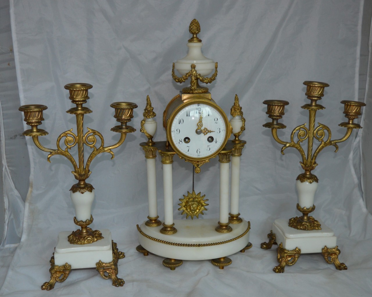 A French candelabra clock set. Two original side candelabra's in gilt with white marble. An enamel dial with finely pierced gilt brass hands. A sunburst pendulum bob. A convex enamel dial. An 8-day duration mechanism striking the 1/2 hours and hours on a gong by A D Mougin. Circa 1900.
