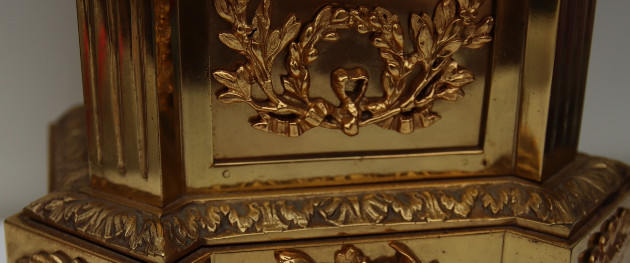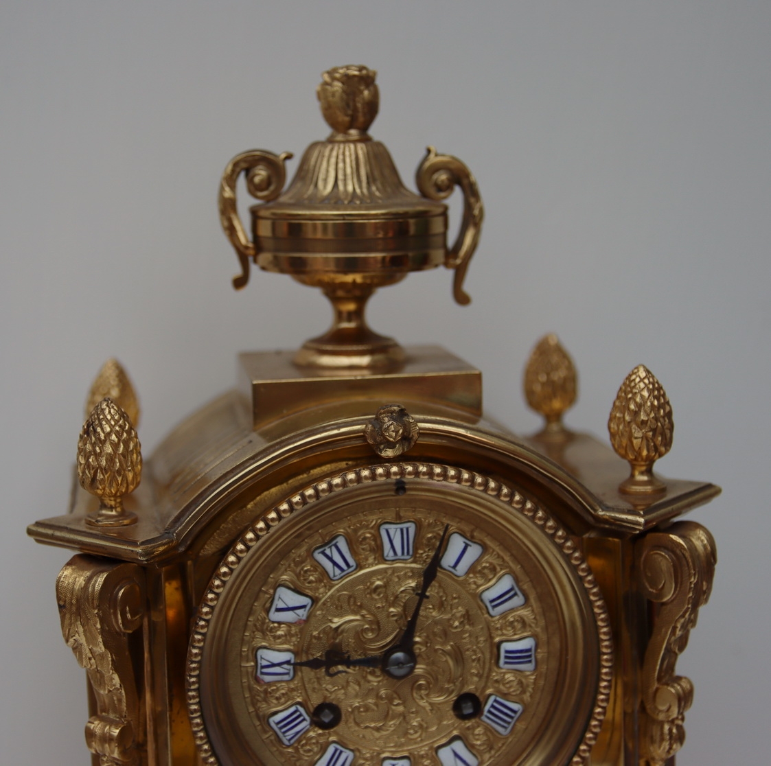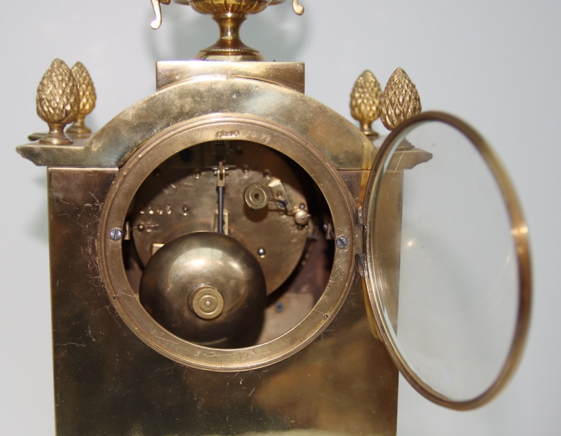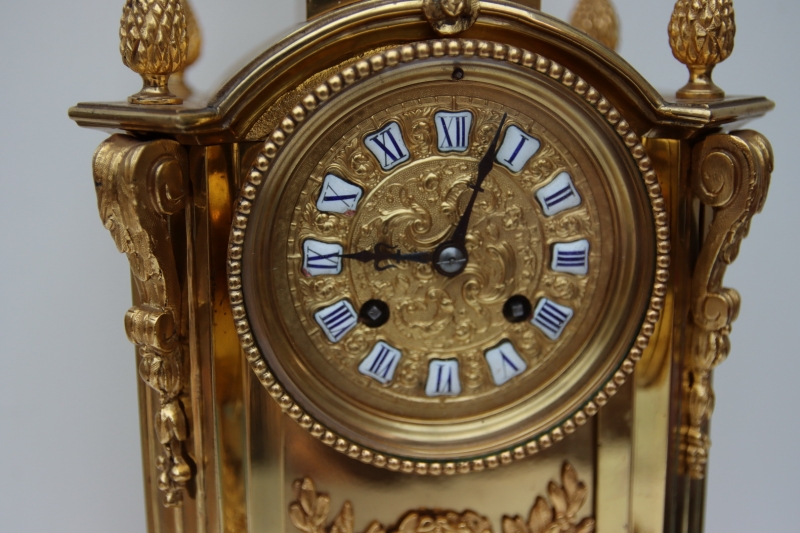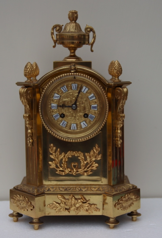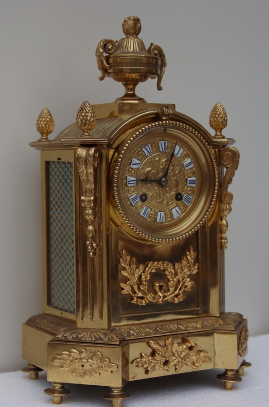 A good quality gilt bronze mantel clock. Acorn finials to the arched top and surmounted by a classical urn. Scrolled mounts to the chamfered case sides and applied gilt ormolu floral mounts to the case. Fretwork panels to the sides and a glass rear door showing the mechanism. A gilt embossed dial with blue Roman numeral enamel cartouches. Adjustable feet. An 8-day duration mechanism striking the 1/2 hours and hours on a bell signed Japay Freres. Circa 1895.