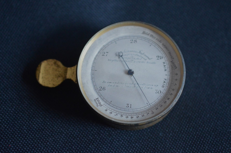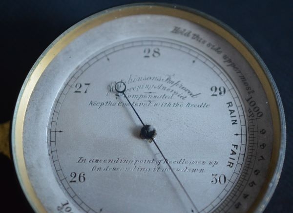 A good quality pocket surveying barometer. A silvered dial with scale from 26 to 31". A rotating outer bezel concentric altimeter calibrated in feet from 0 to 1000. Engraved to the dial 'HUTCHINSON'S IMPROVED SURVEYING ANEROID' with instructions engraved. A thumb piece to the left hand side. The original case gilding. Circa 1895.