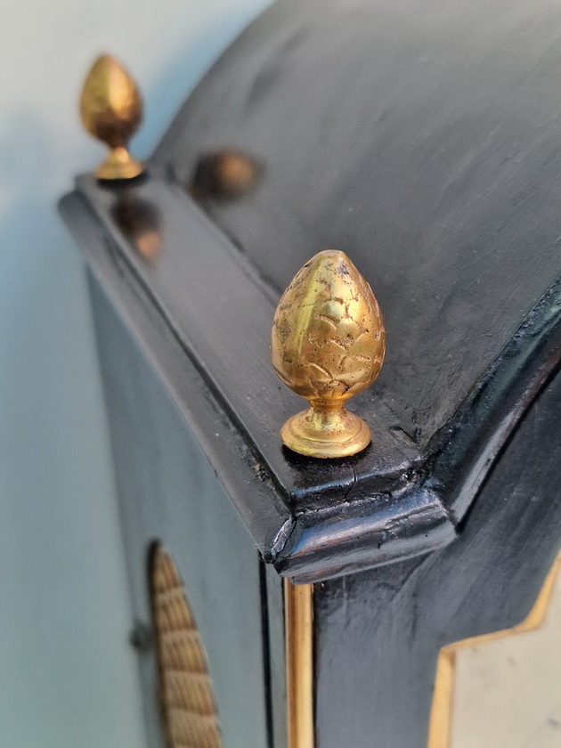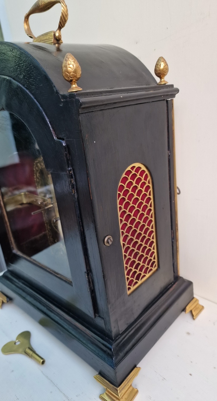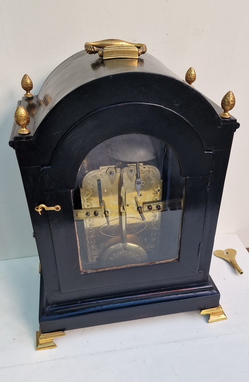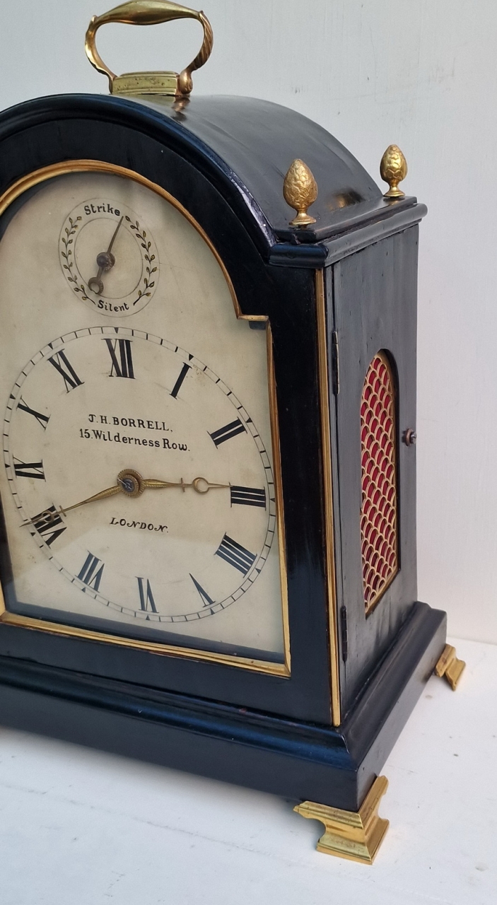 A London, ebonised bracket/table clock of good proportions. The case front has gilded brass edging to the dial and standing on gilded ogee feet. Brass fretwork to the case sides with silk backing. Gilded brass edging to the case sides. An arched painted dial signed 'J H Borrell 15 Wilderness Row, London' with a strike/silent to the arch. Lovely engraved hands. A fine quality, twin fusee mechanism striking the 1/2 hours and hours on a bell. A beautifully engraved backplate to the mechanism signed 'J H Borrell, London' within a cartouche. A glass back door showing the mechanism. Circa 1835.
