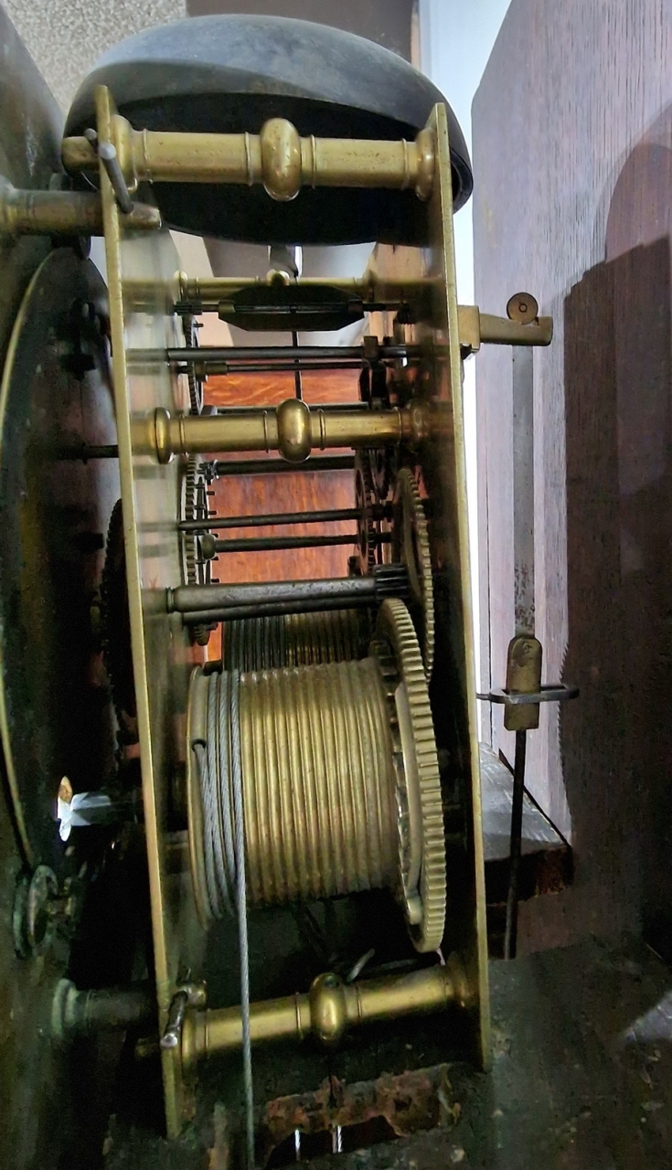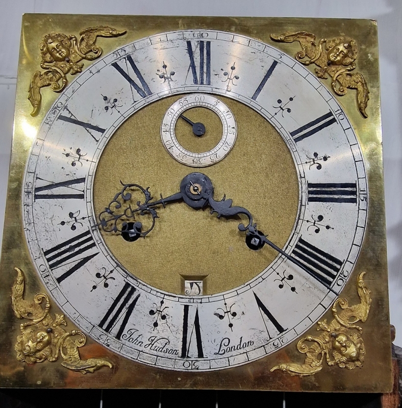 A 10" brass and silvered dial with small winged cherub corner spandrels. A silvered chapter ring engraved 'John Hudson, London'. A gilt matted dial centre with a date aperture and seconds dial. Brass cased weights. A 5 pillar, month duration mechanism striking the hours on a bell. An outside striking count wheel. Circa 1690.