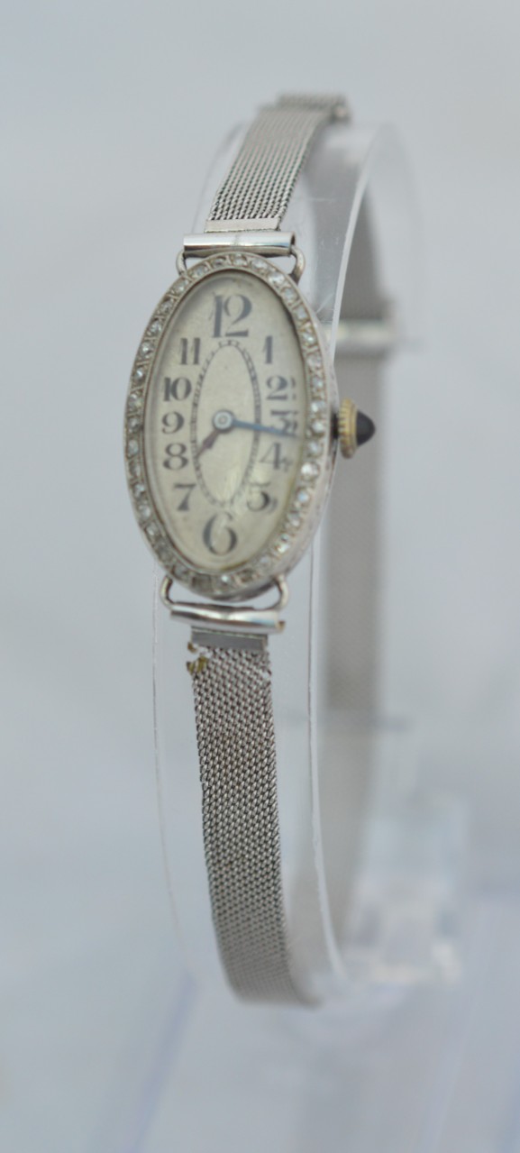 A ladies Art Deco period platinum and diamond bezel cocktail watch. The original white gold mesh strap. A cabouchon winder and the original silvered dial. Circa 1930.