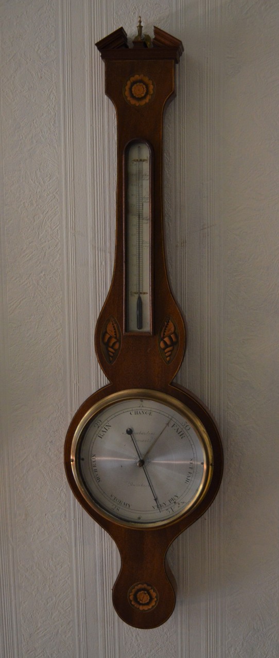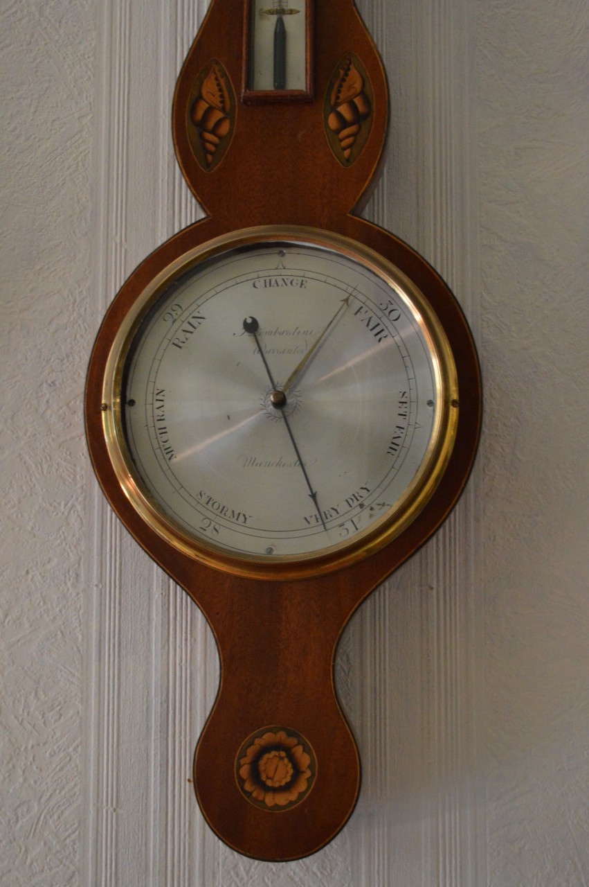 A Georgian period mercury wheel barometer. A mahogany case with an architectural pediment and brass central finial. Marquetry and parquetry shell inlays to the case with green background. A long engraved silvered dial. The main dial is engraved 'LOMBARDINI MANCHESTER'. Circa 1820.