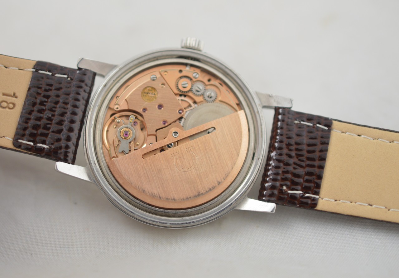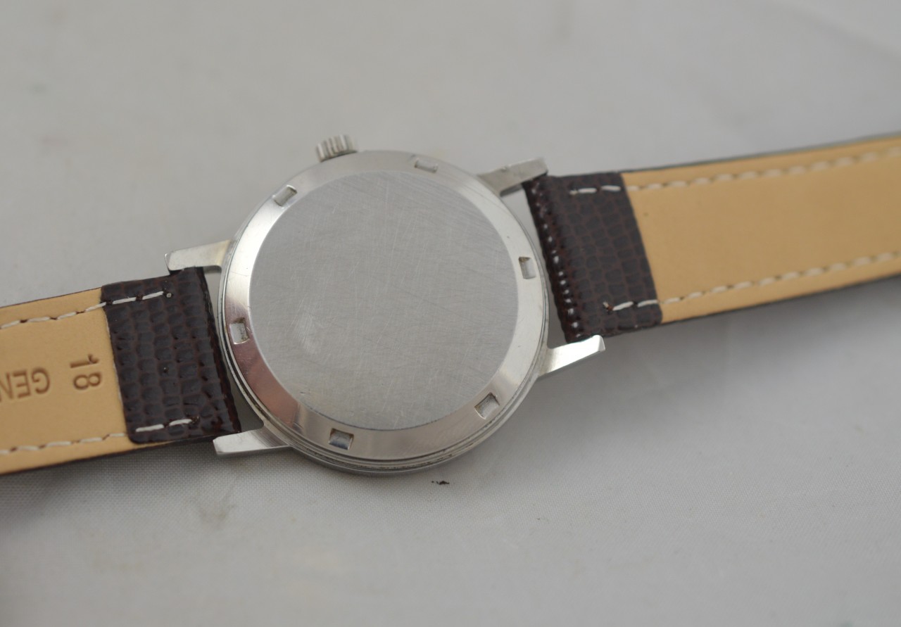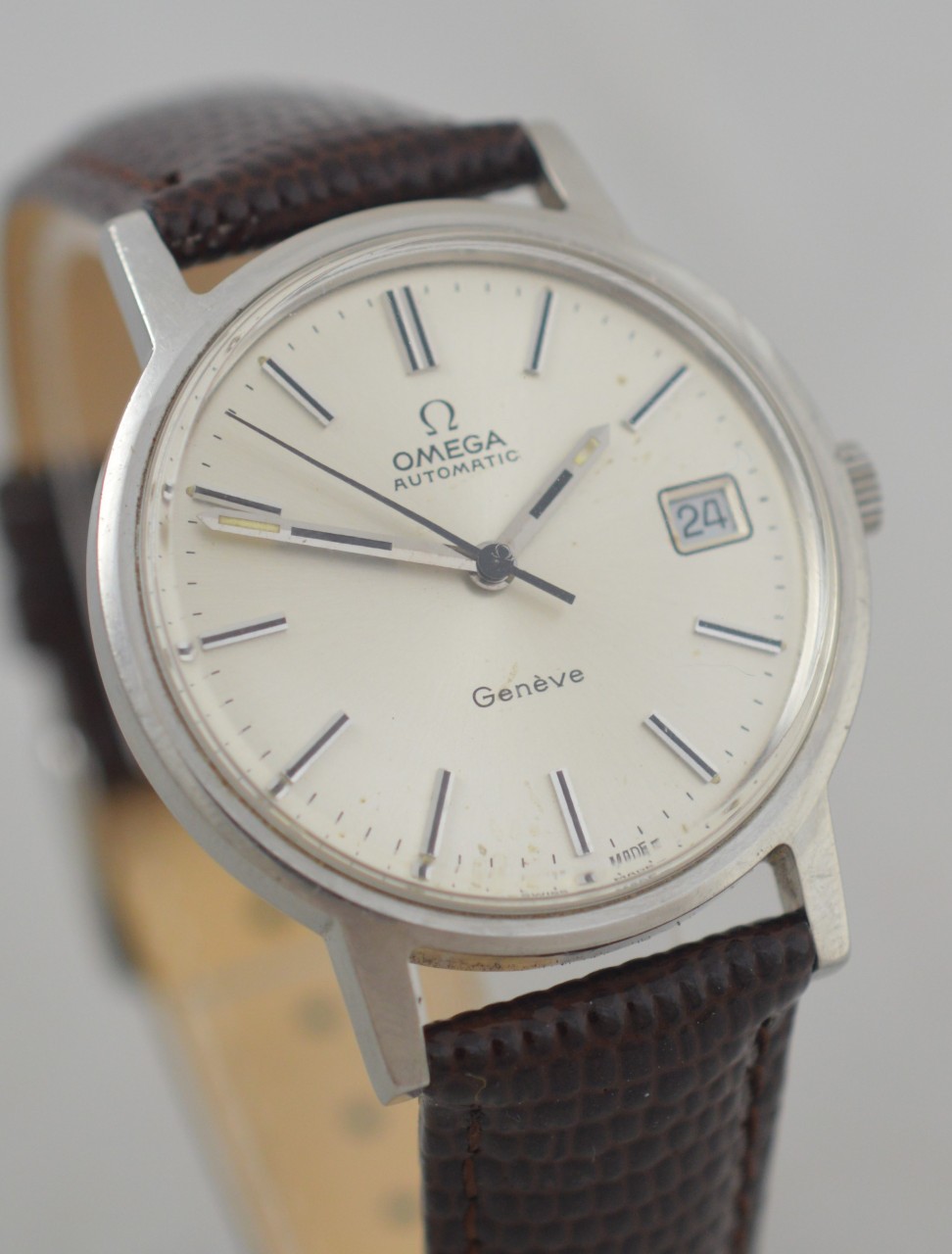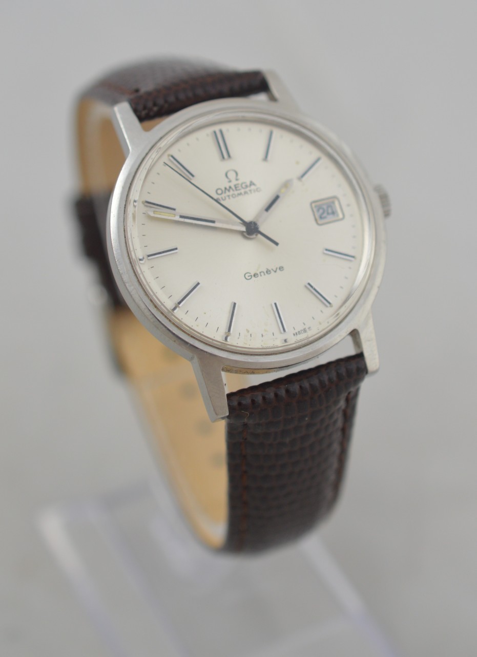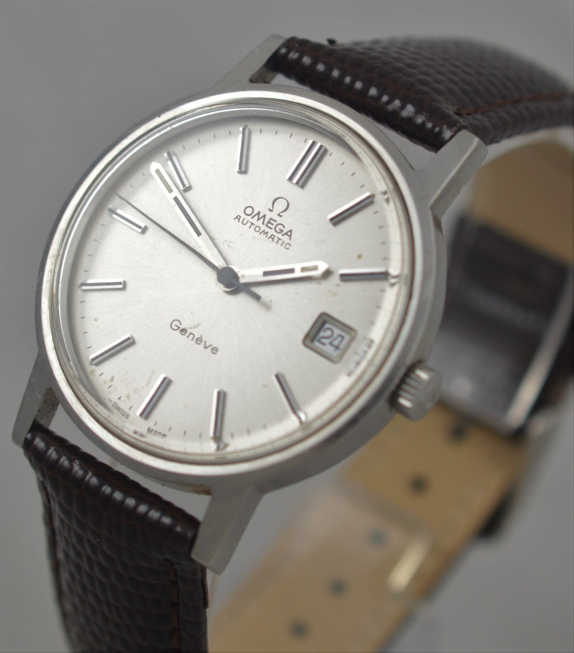 A 1973 Omega Geneve Automatic wristwatch. A silvered dial with applied steel batons, each finished with a central black stip. The hour and minute hands of similar design to the batons with lume strip at the ends. Date aperture at 3 position. A stainless steel case with screw down back and Omega winding crown. A 23 jewel caliber 1012 automatic Omega mechanism. Serial numbers date this watch to 1973.