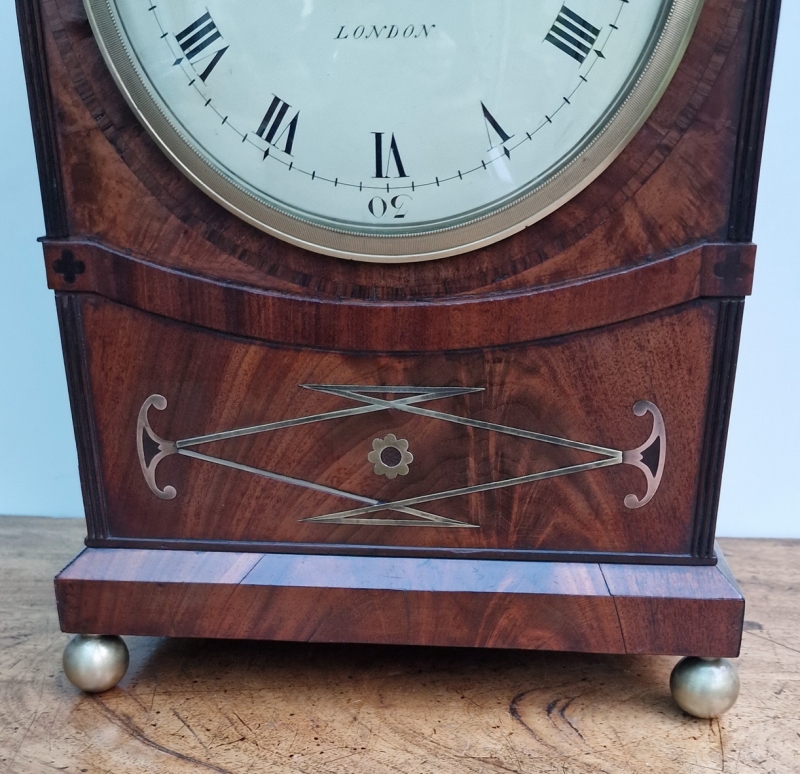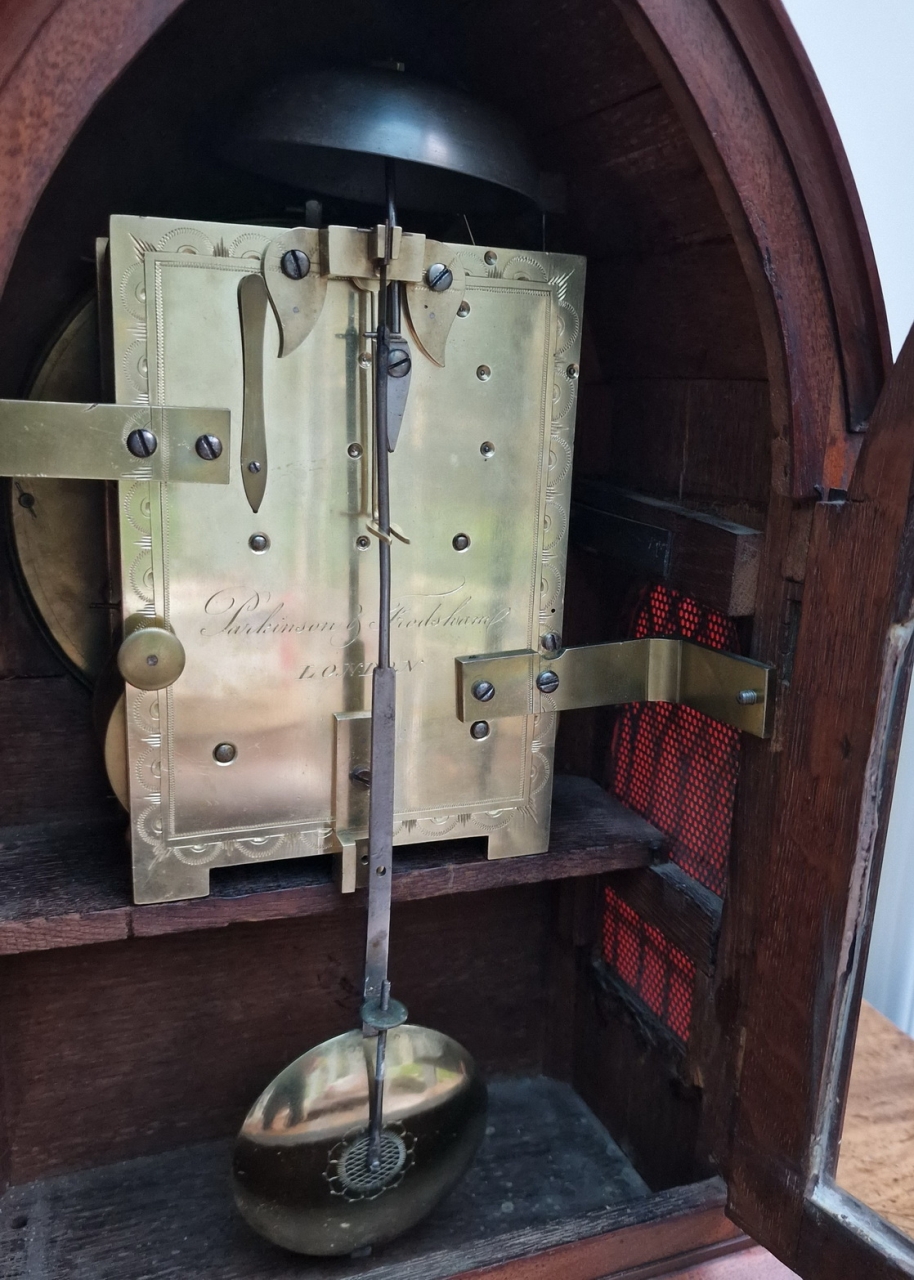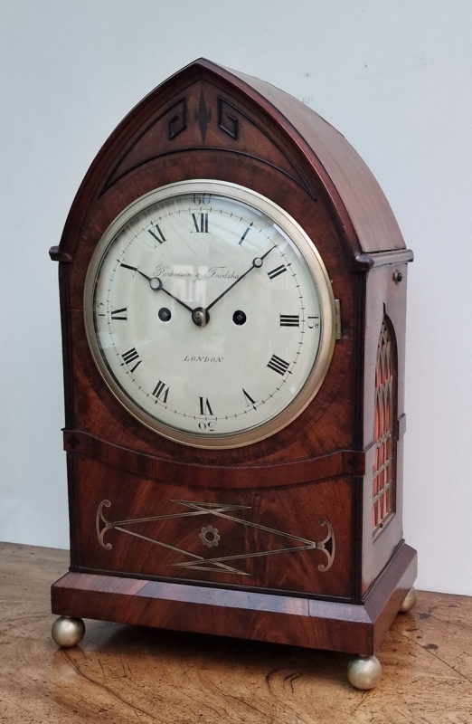 An English Georgian twin fusee bracket/table clock. An elegant lancet top mahogany case with choice flame veneers. Brass sound fretted side panels with silk backing. An engraved cast brass bezel with convex glass and standing on brass ball feet. An arched glass back door. A convex dial with blued steel hands signed 'Parkinson & Frodsham, London'. A strike/silent lever to the top of the dial. A quality double fusee mechanism striking the hours on a bell of 8-day duration. Signed 'Parkinson & Frodsham London' to the backplate and border engraving. A good quality steel and brass pendulum with engraving. A pendulum transportation lock. Circa 1820.