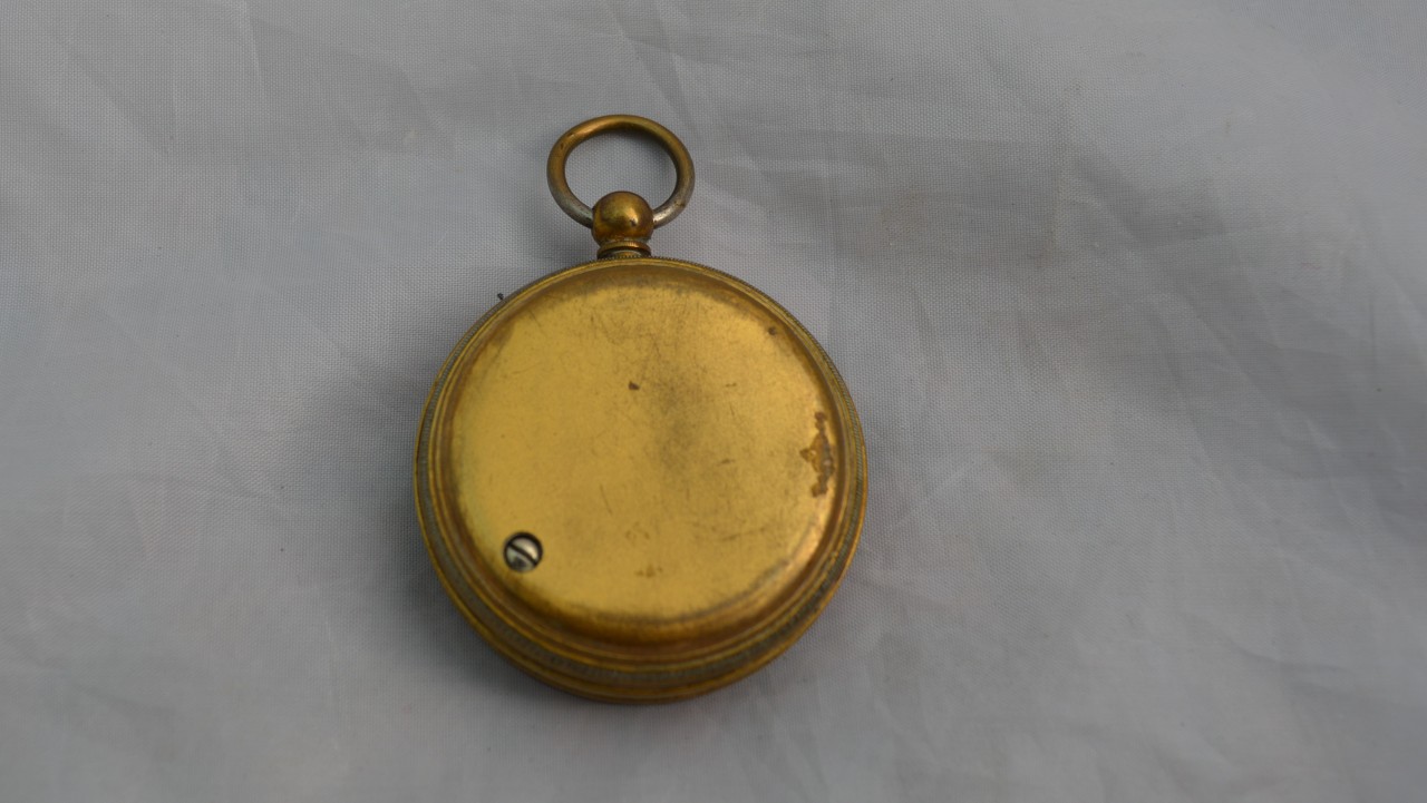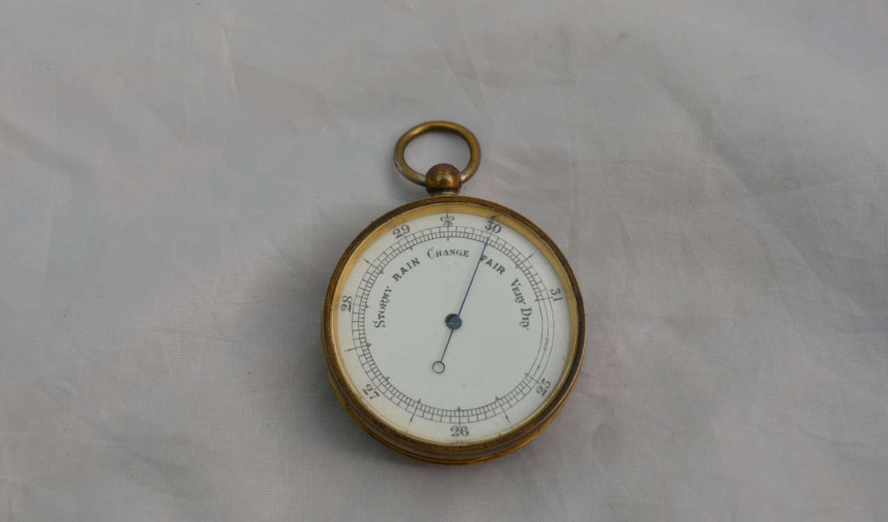 An English pocket barometer. The original gilded case with rotating bezel. An enamel dial with indicators from 25 to 31 inches covered by bevelled glass. Circa 1895.