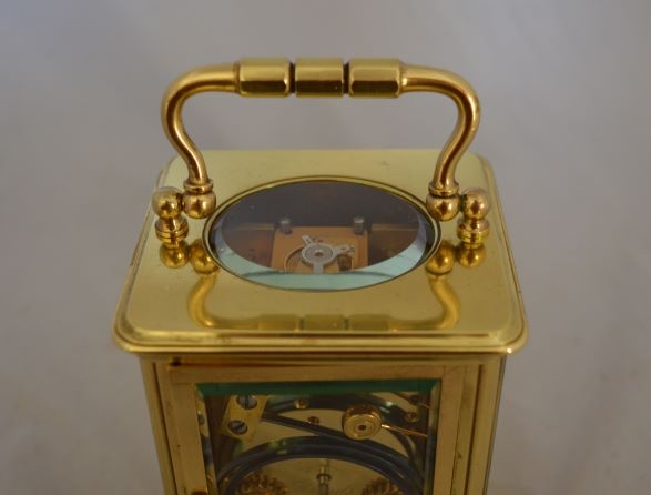 A French brass cased striking carriage clock. An enamel dial with blued steel hands and black Roman numerals. An 8-day duration mechanism striking the hours and 1/2 hours on a gong. Movement backplate with Richard & Co stamped mark.. A lever escapement. Circa 1895.