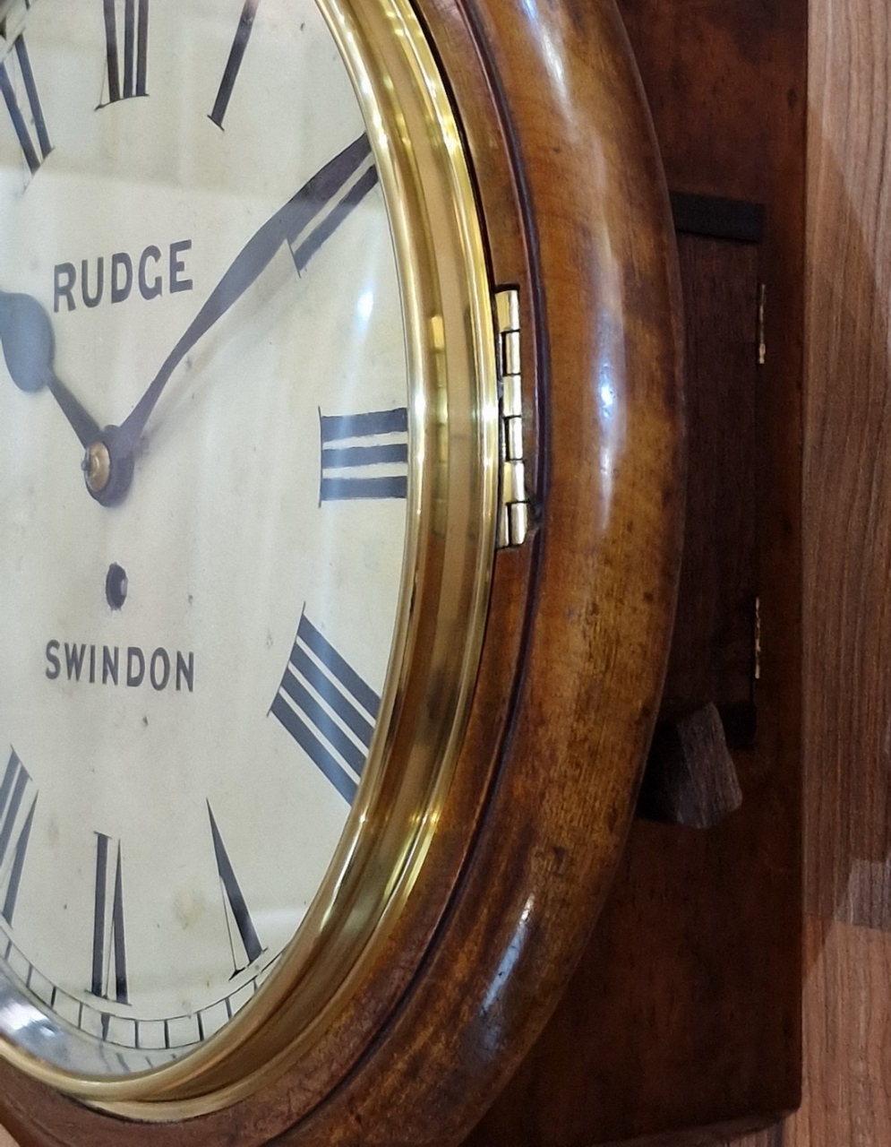 A Victorian fusee dial wall clock. A 12" painted dial signed 'RUDGE SWINDON' with blued steel hands. A light mahogany case with a brass bezel surround. An 8-day duration fusee timepiece mechanism. Circa 1890.