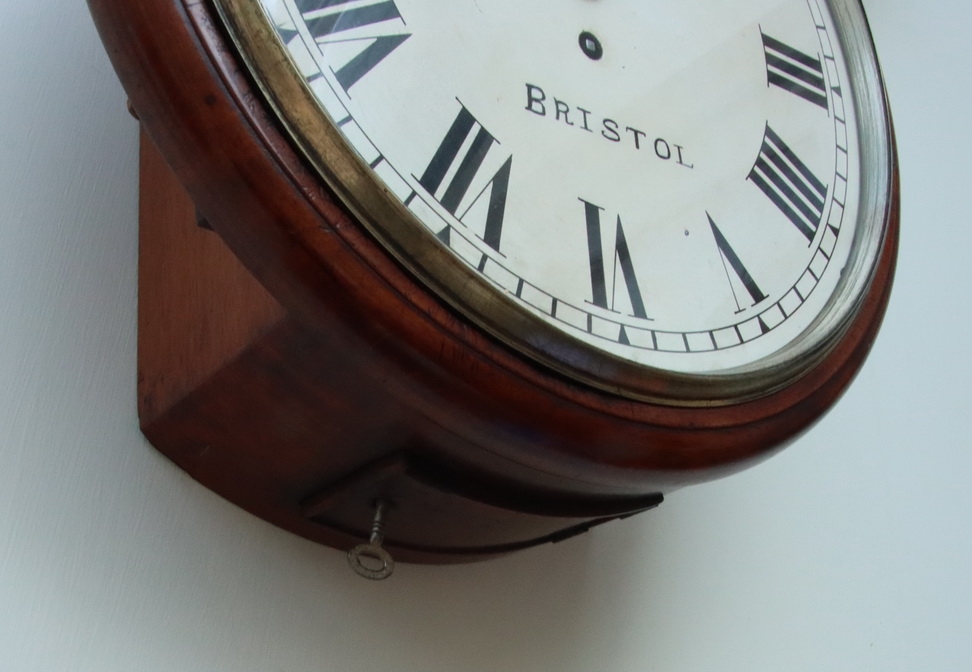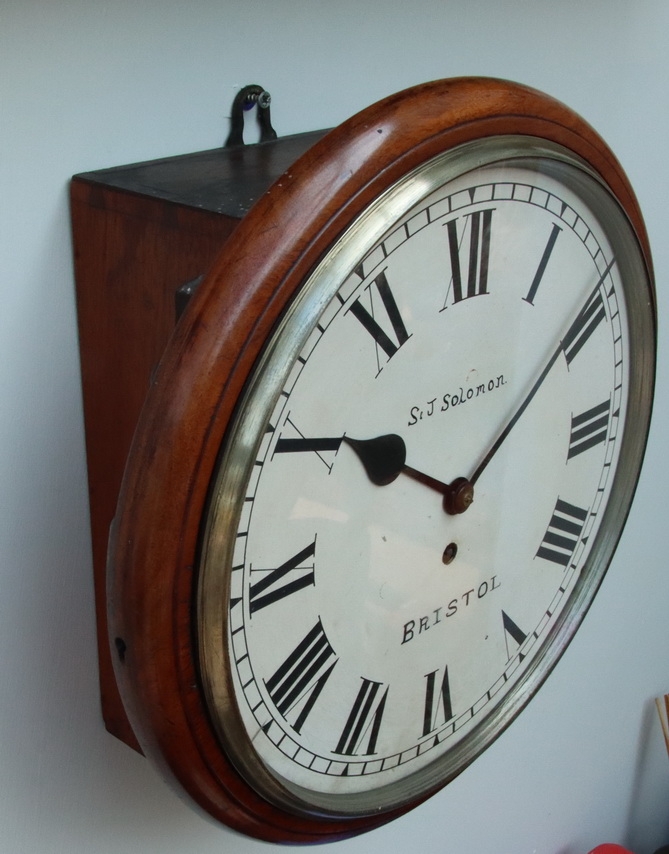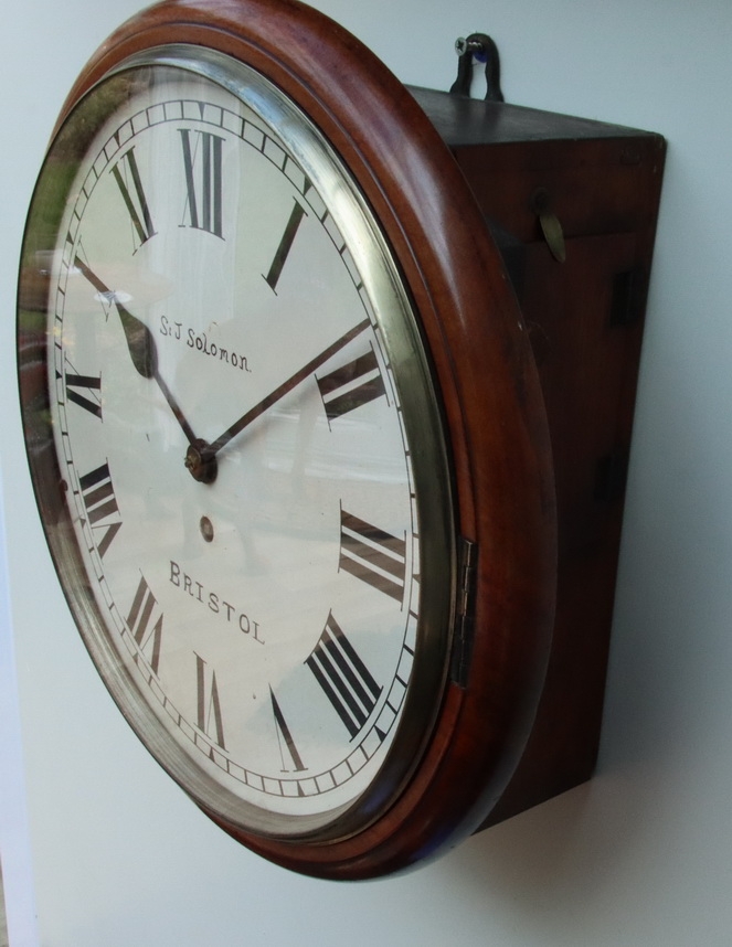 An English Victorian fusee dial wall clock. A well proportioned mahogany case with a cast brass bezel surround. A 12" painted dial with blued steel hands and signed 'S & J Solomon, Bristol'. An 8-day duration timepiece fusee mechanism. Circa 1860.