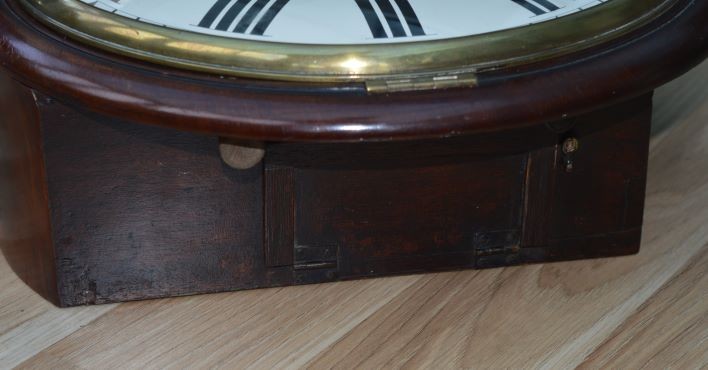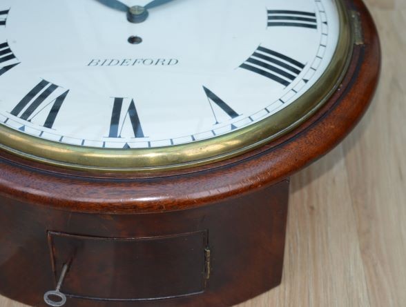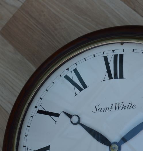 A fine quality English Georgian convex dial wall clock. A slim mahogany case with a cast brass bezel surround and domed glass. A painted dial signed 'Sam White, Bideford'. An 8-day duration timepiece mechanism with shaped plates. Circa 1830.