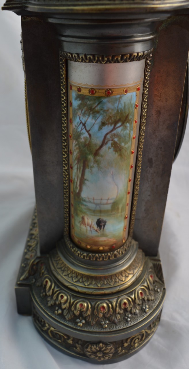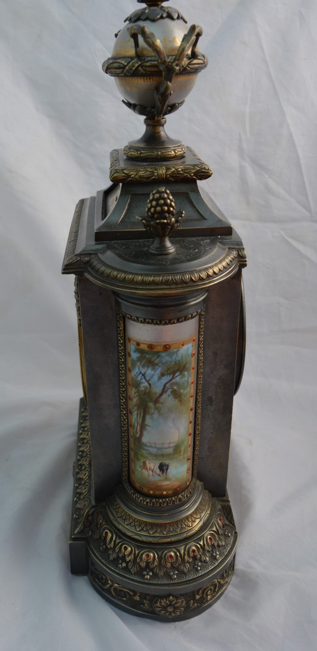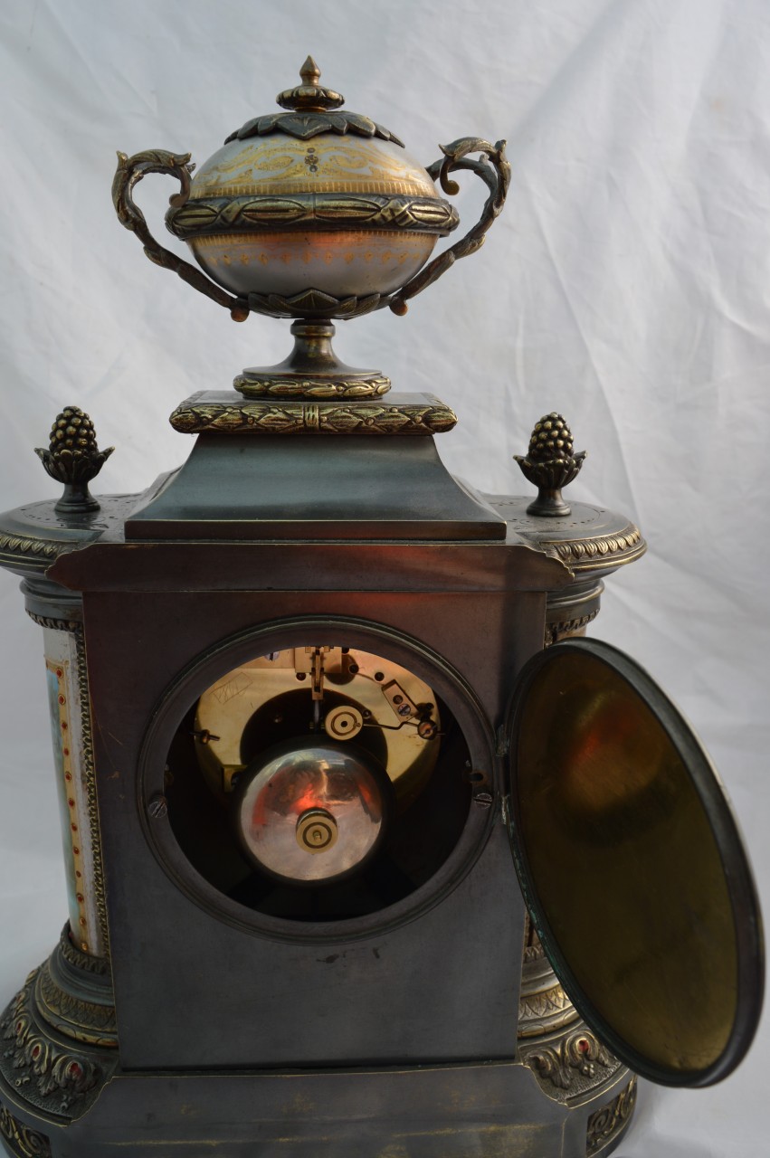An impresive French silvered patinated bronze mantel clock. High quality signed porcelain panels to the front, top and convex sides. Finials to the top and surmounted by an urn. Contrasting brass case mouldings. A circular porcelain dial with red jewelled markings and blued steel hands. An 8-day duration mechanism signed by Brocot striking the 1/2 hours and hours on a bell. Circa 1880.