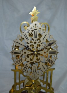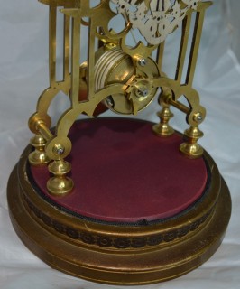 An English Victorian Skeleton clock. An original glass dome to the giltwood and silk base. A very well fretted silvered dial with Roman numerals. Blued steel hands. An 8-day duration fusee mechanism. Circa 1870.