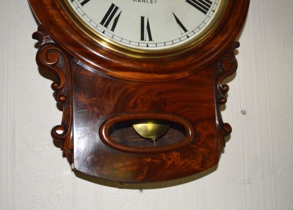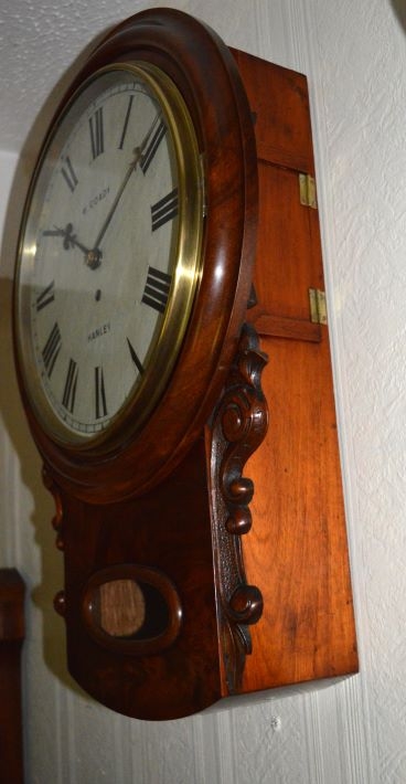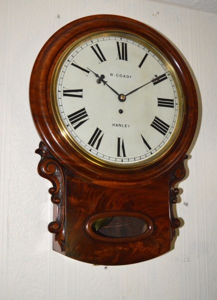 A Victorian Midlands area drop dial fusee wall clock. A mahogany case with lovely choice grain to the wood and the original side carvings. A carved glazed pendulum aperture. A brass bezel surround to the dial. A 12" painted dial signed ' W COADY, HANLEY' with blued steel hands. An 8-day duration fusee mechanism. Circa 1885.