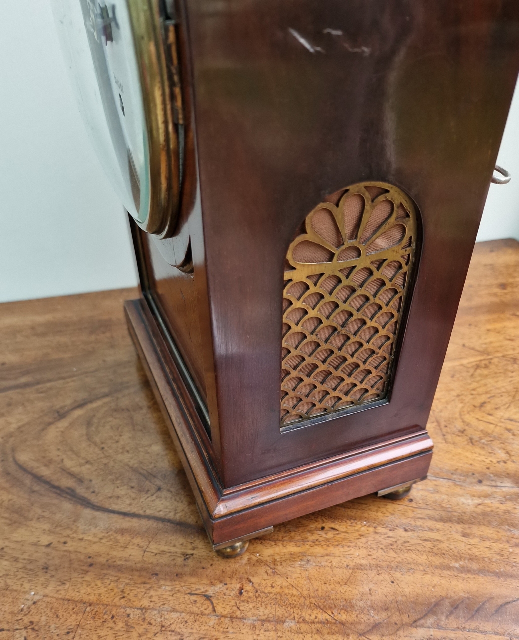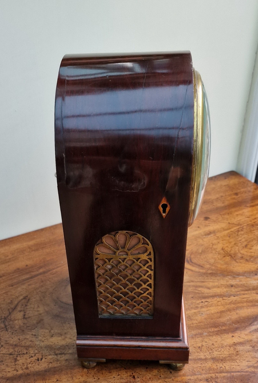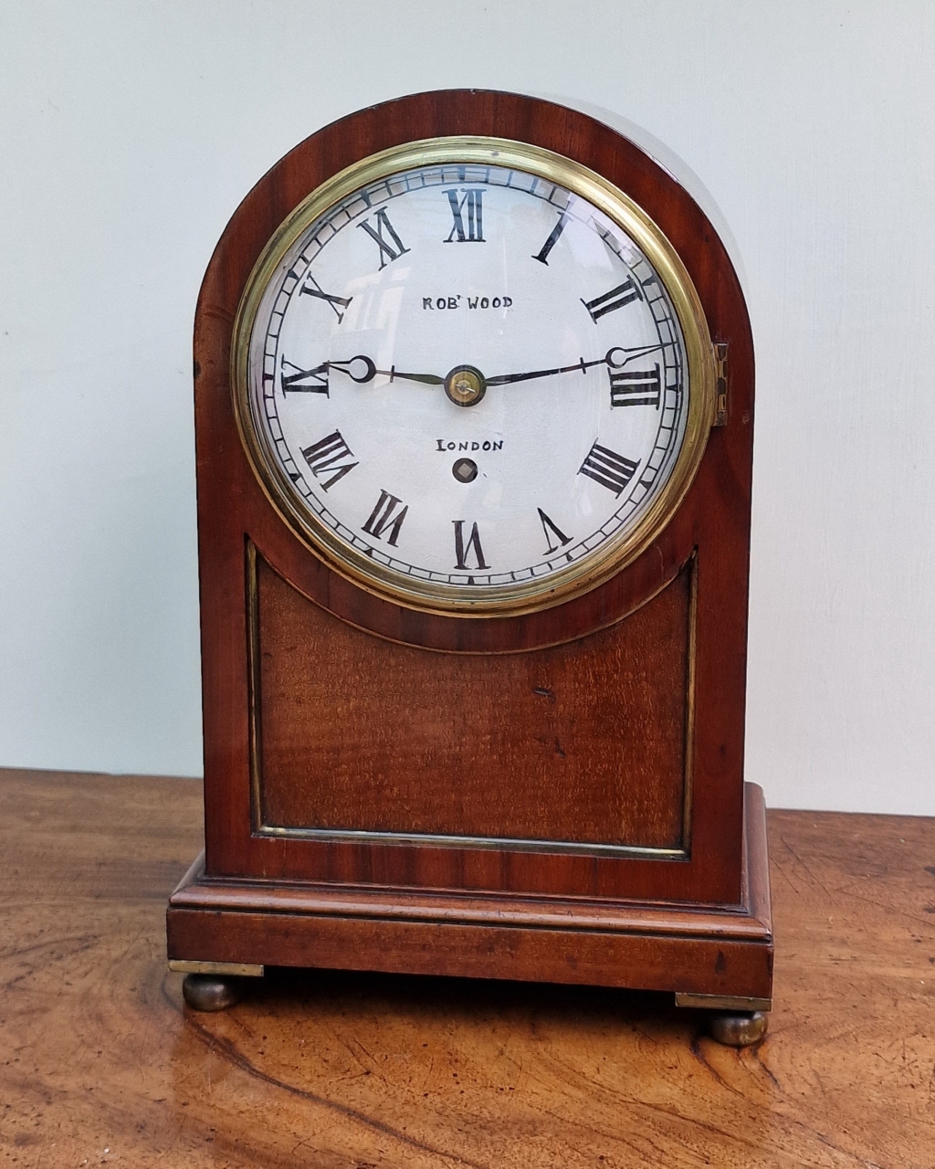 A smaller proportioned English mahogany mantel/bracket clock. A cast brass bezel with convex glass and standing on brass ball feet. A brass edged, recessed front panel. An arched, brass fretted back door. A painted convex dial with blued steel hands signed 'Robt Wood, London'. A quality single fusee mechanism of 8-day duration. The original pendulum transportation lock. Circa 1890.