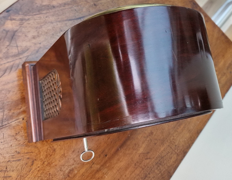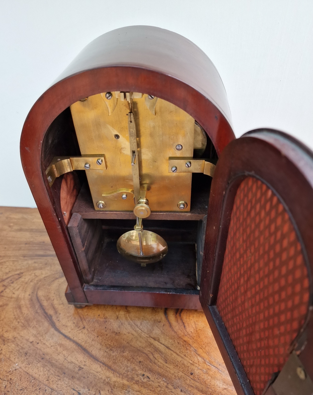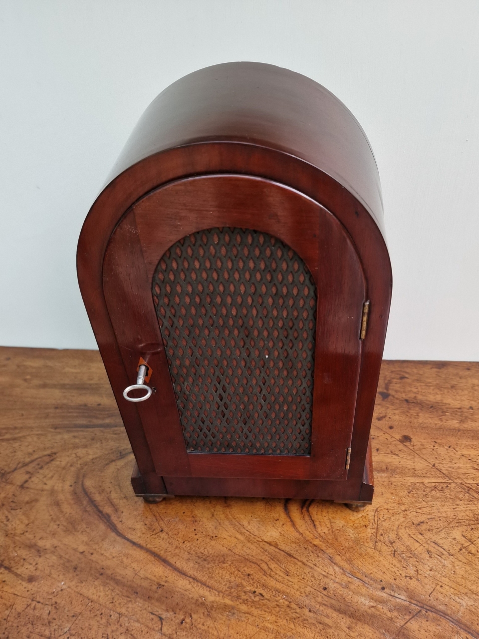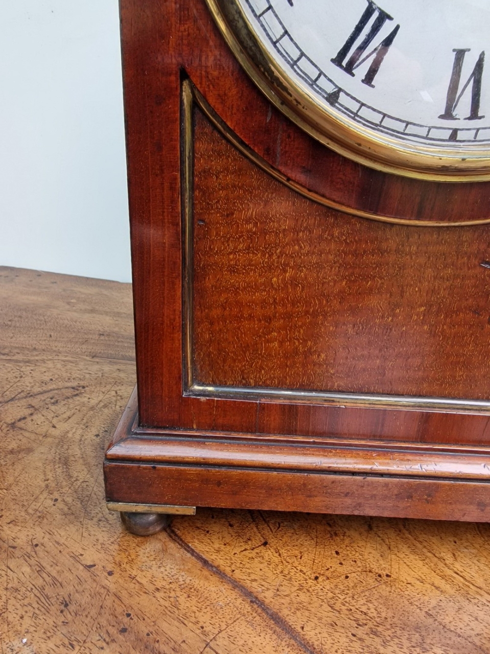 A smaller proportioned English mahogany mantel/bracket clock. A cast brass bezel with convex glass and standing on brass ball feet. A brass edged, recessed front panel. An arched, brass fretted back door. A painted convex dial with blued steel hands signed 'Robt Wood, London'. A quality single fusee mechanism of 8-day duration. The original pendulum transportation lock. Circa 1890.